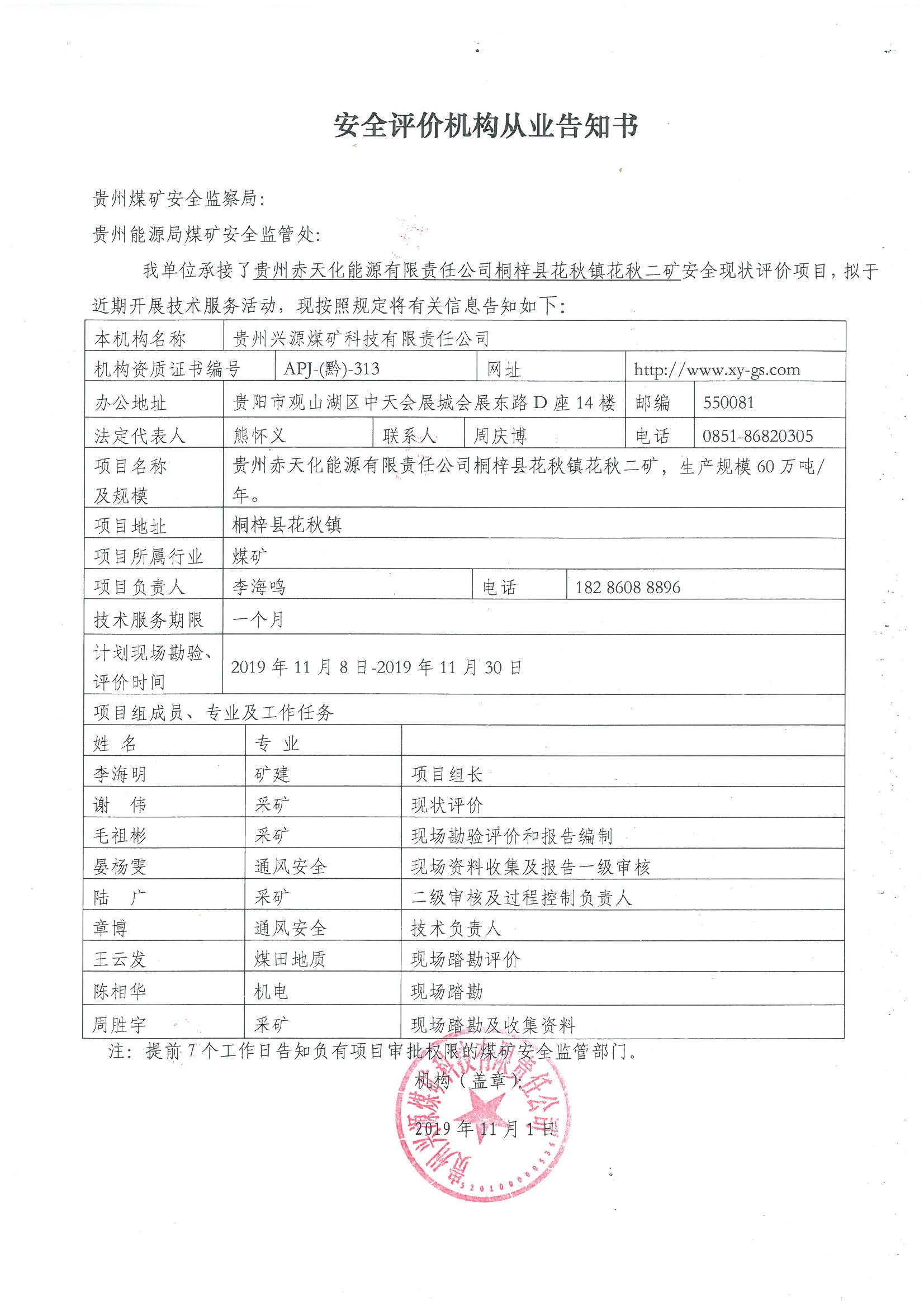 安全評價機構(gòu)從業(yè)告知書[貴州赤天化能源有限責(zé)任公司桐梓縣花秋鎮(zhèn)花秋二礦]