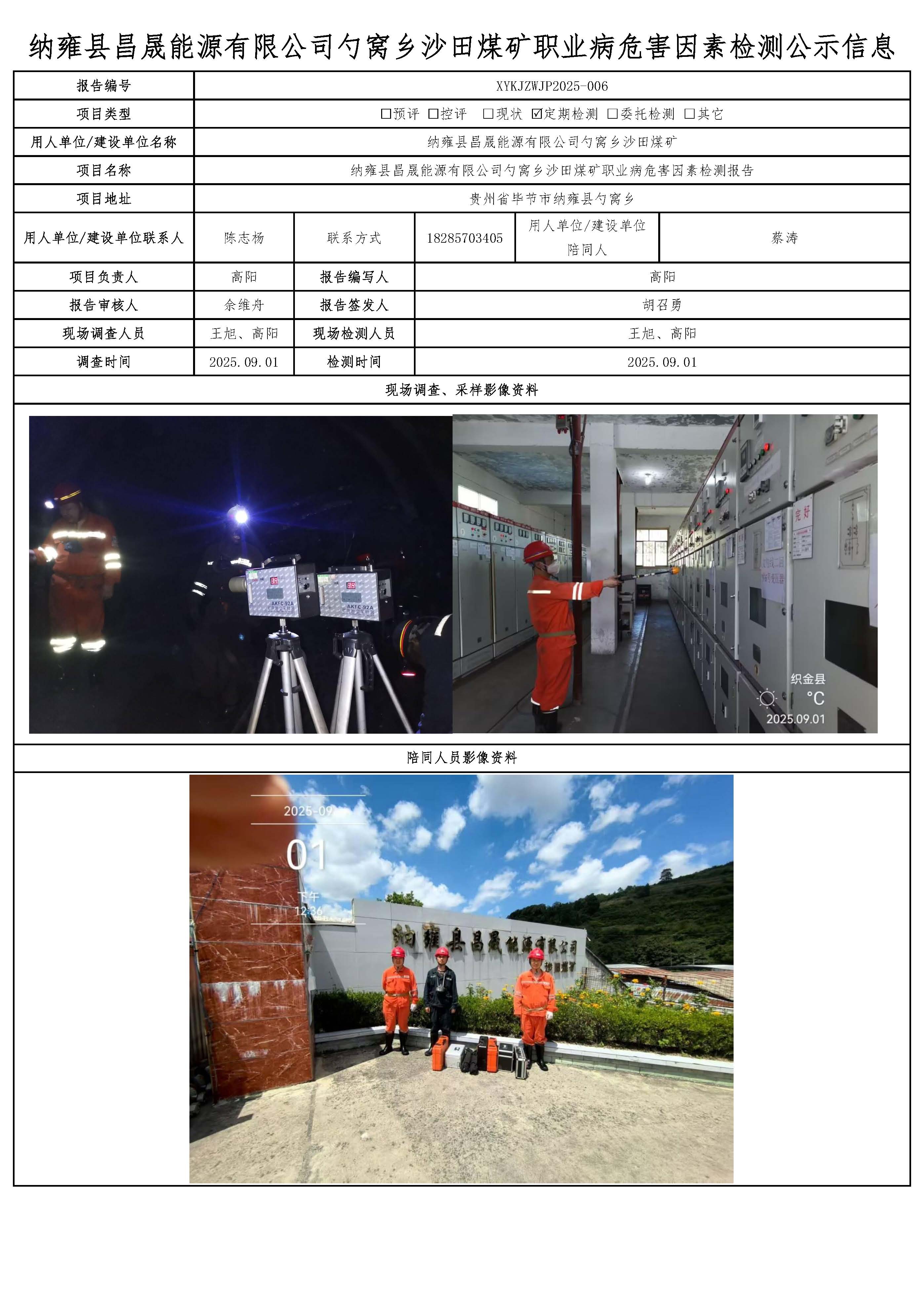 納雍縣昌晟能源有限公司勺窩鄉(xiāng)沙田煤礦職業(yè)病危害因素檢測公示信息
