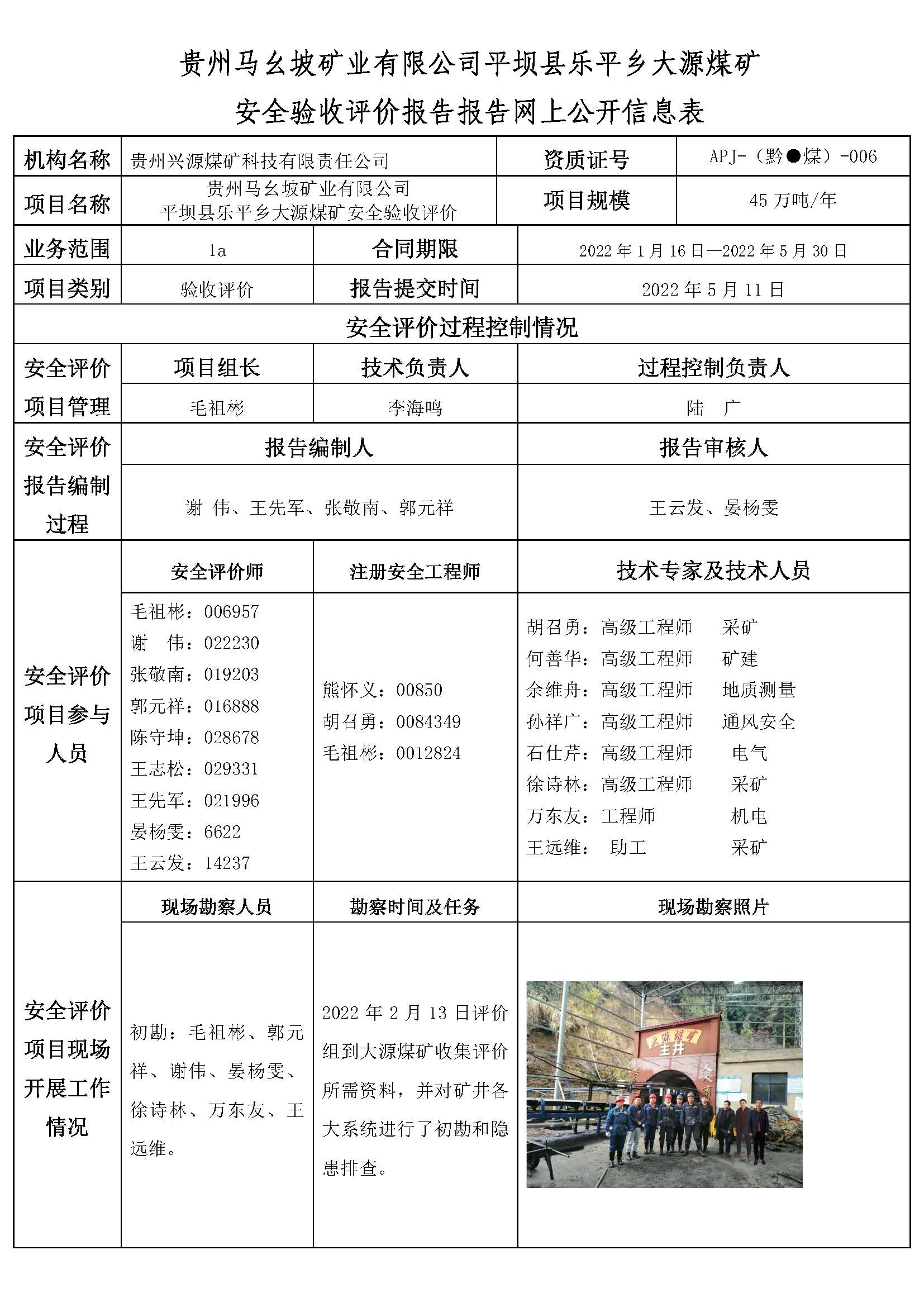 平壩縣樂(lè)平鄉(xiāng)大源煤礦(兼并重組)安全驗(yàn)收評(píng)價(jià)報(bào)告