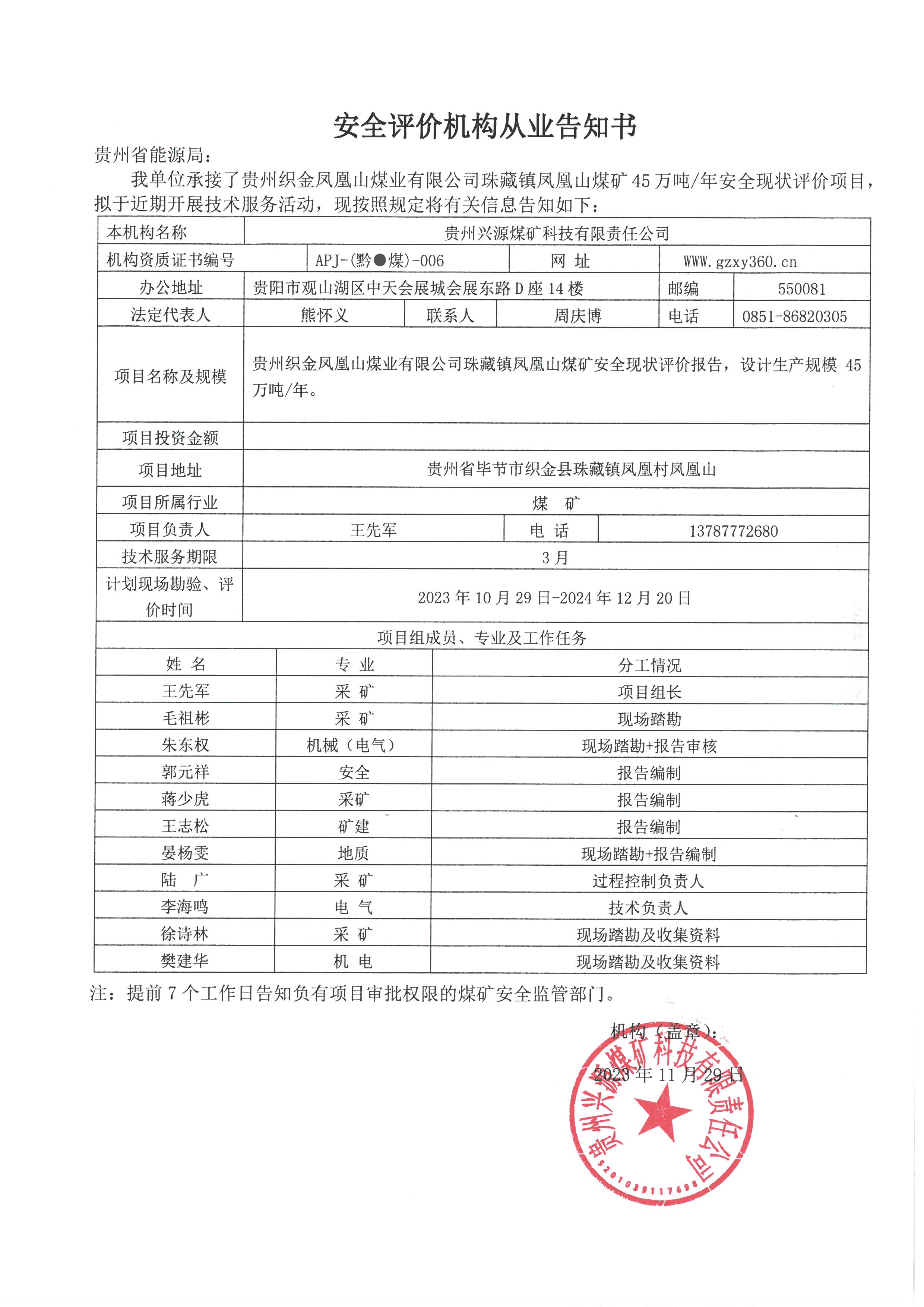 安全評(píng)價(jià)機(jī)構(gòu)從業(yè)告知書(shū)[貴州織金鳳凰山煤業(yè)有限公司珠藏鎮(zhèn)鳳凰山煤礦]