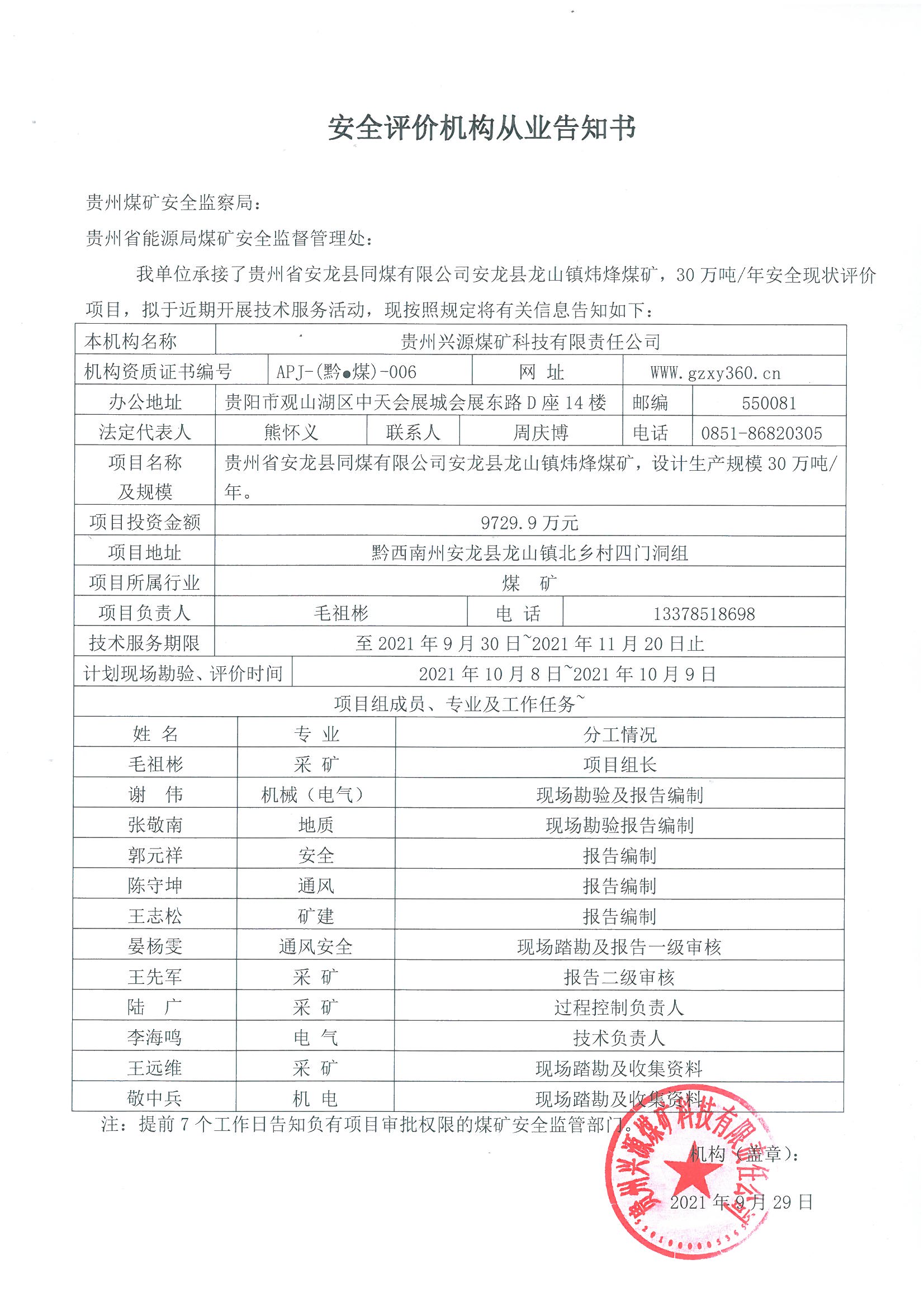 安全評(píng)價(jià)機(jī)構(gòu)從業(yè)告知書(shū)(貴州省安龍縣同煤有限公司安龍縣龍山鎮(zhèn)煒?lè)槊旱V)