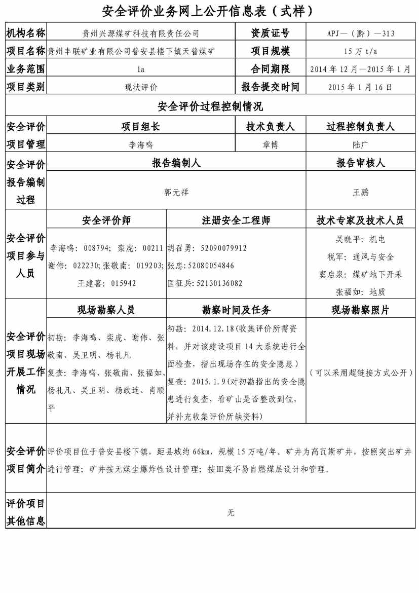 貴州豐聯(lián)礦業(yè)有限公司普安縣樓下鎮(zhèn)天普煤礦安全評價業(yè)務網(wǎng)上公開信息表