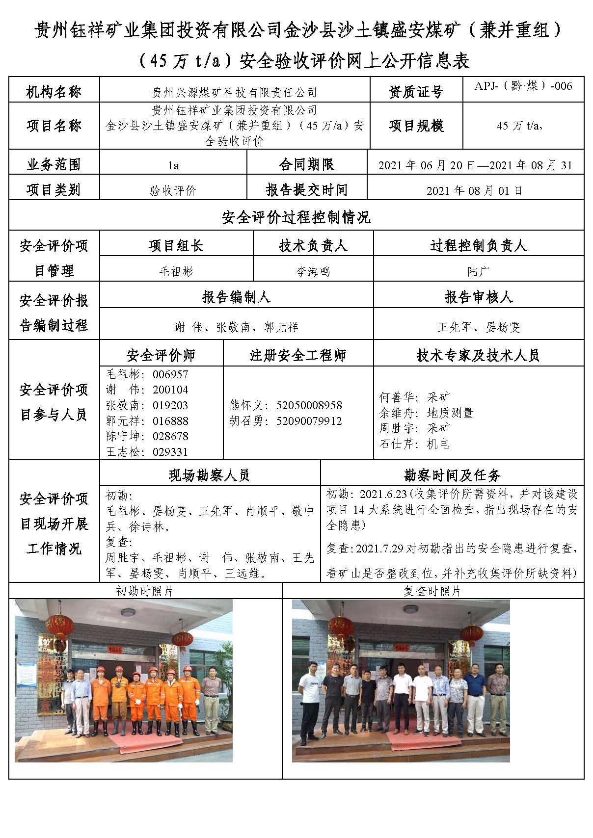 貴州鈺祥礦業(yè)集團(tuán)投資有限公司金沙縣沙土鎮(zhèn)盛安煤礦(兼并重組)(45萬t/a)安全驗(yàn)收評(píng)價(jià)網(wǎng)上公開信息表