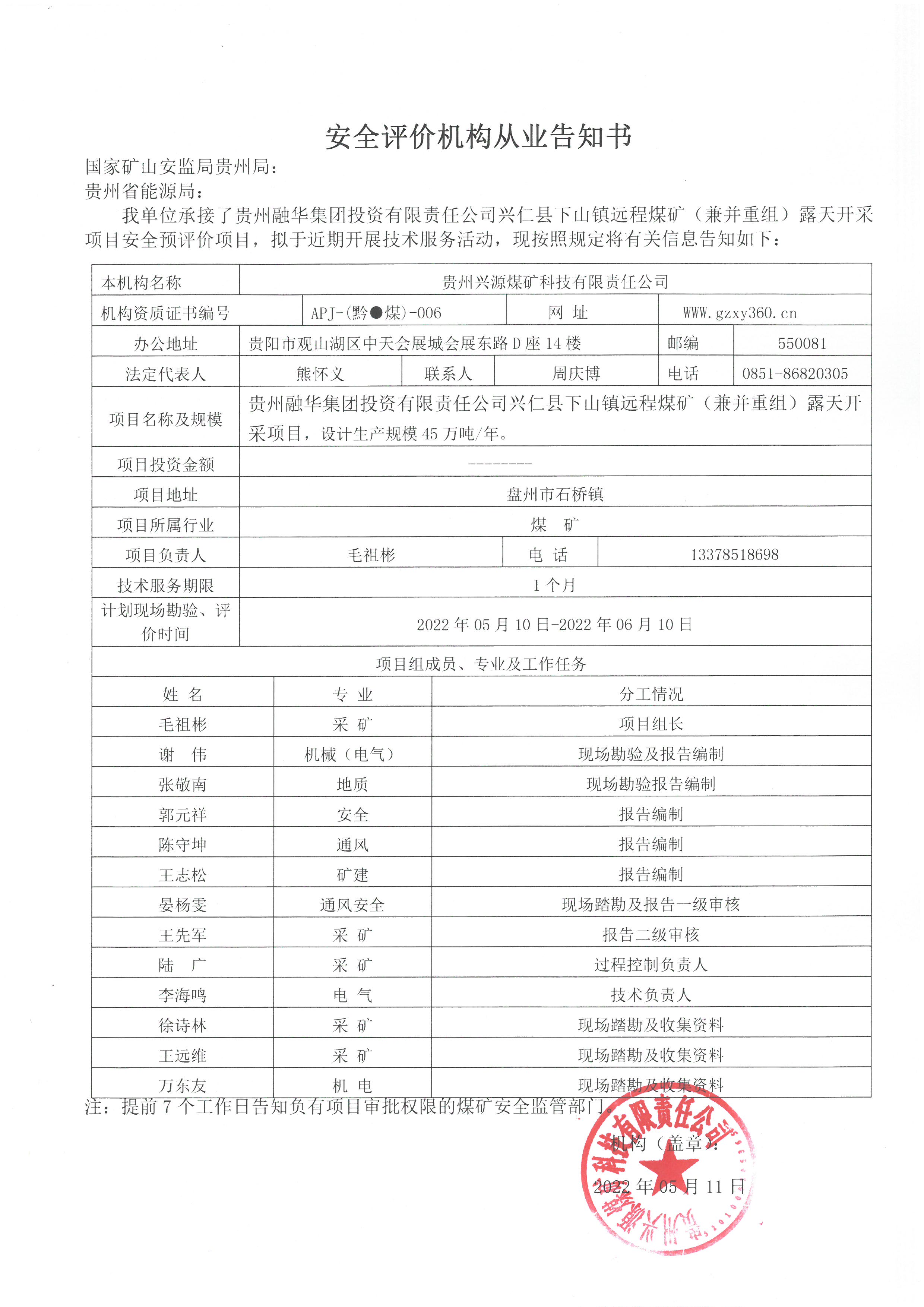 安全評(píng)價(jià)機(jī)構(gòu)從業(yè)告知書(貴州融華集團(tuán)投資有限責(zé)任公司興仁縣下山鎮(zhèn)遠(yuǎn)程煤礦(兼并重組)露天開采項(xiàng)目安全預(yù)評(píng)價(jià))