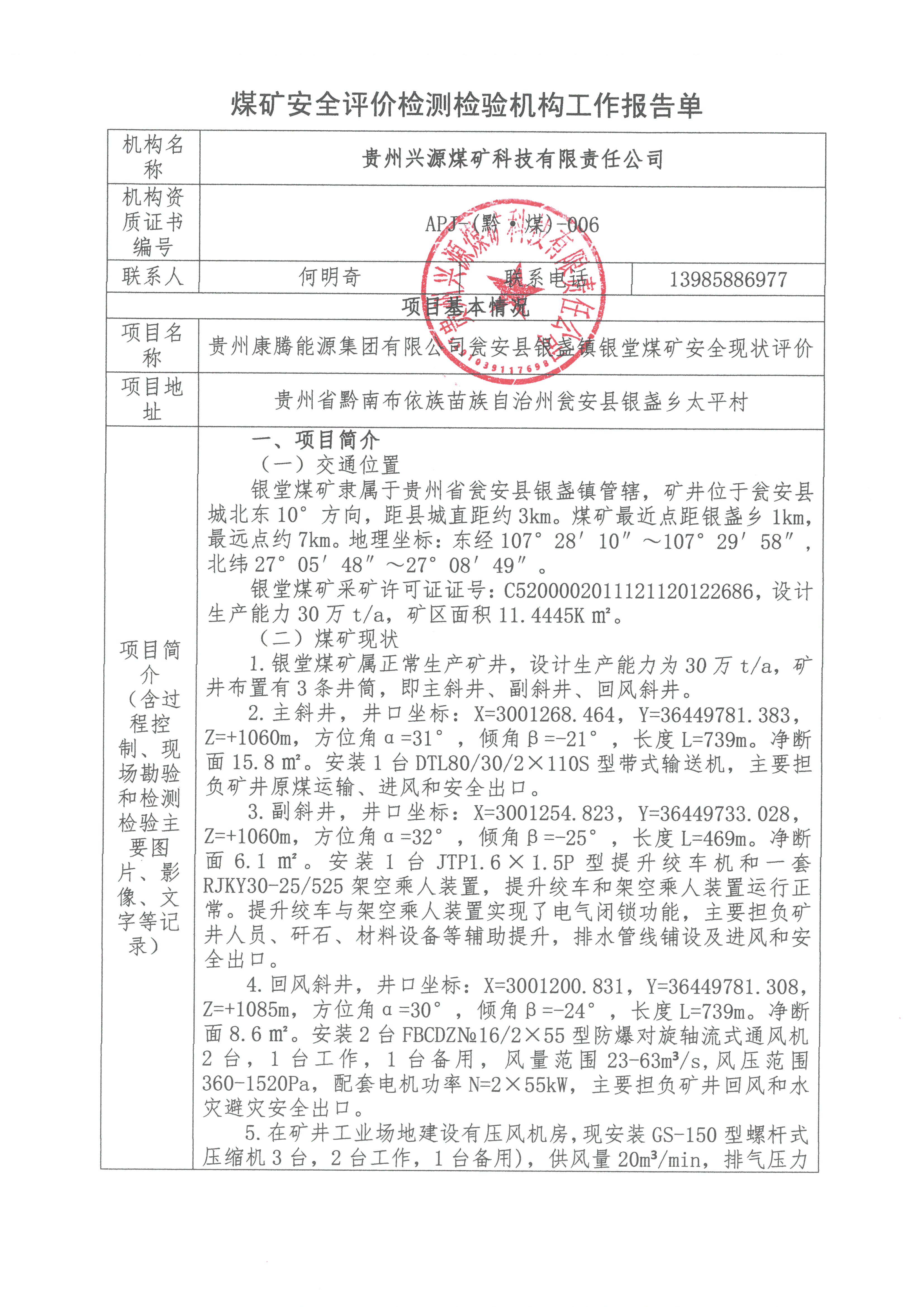 煤礦安全評價檢測檢驗機構(gòu)工作報告單【貴州康騰能源集團(tuán)有限公司甕安縣銀盞鎮(zhèn)銀堂煤礦安全現(xiàn)狀評價】