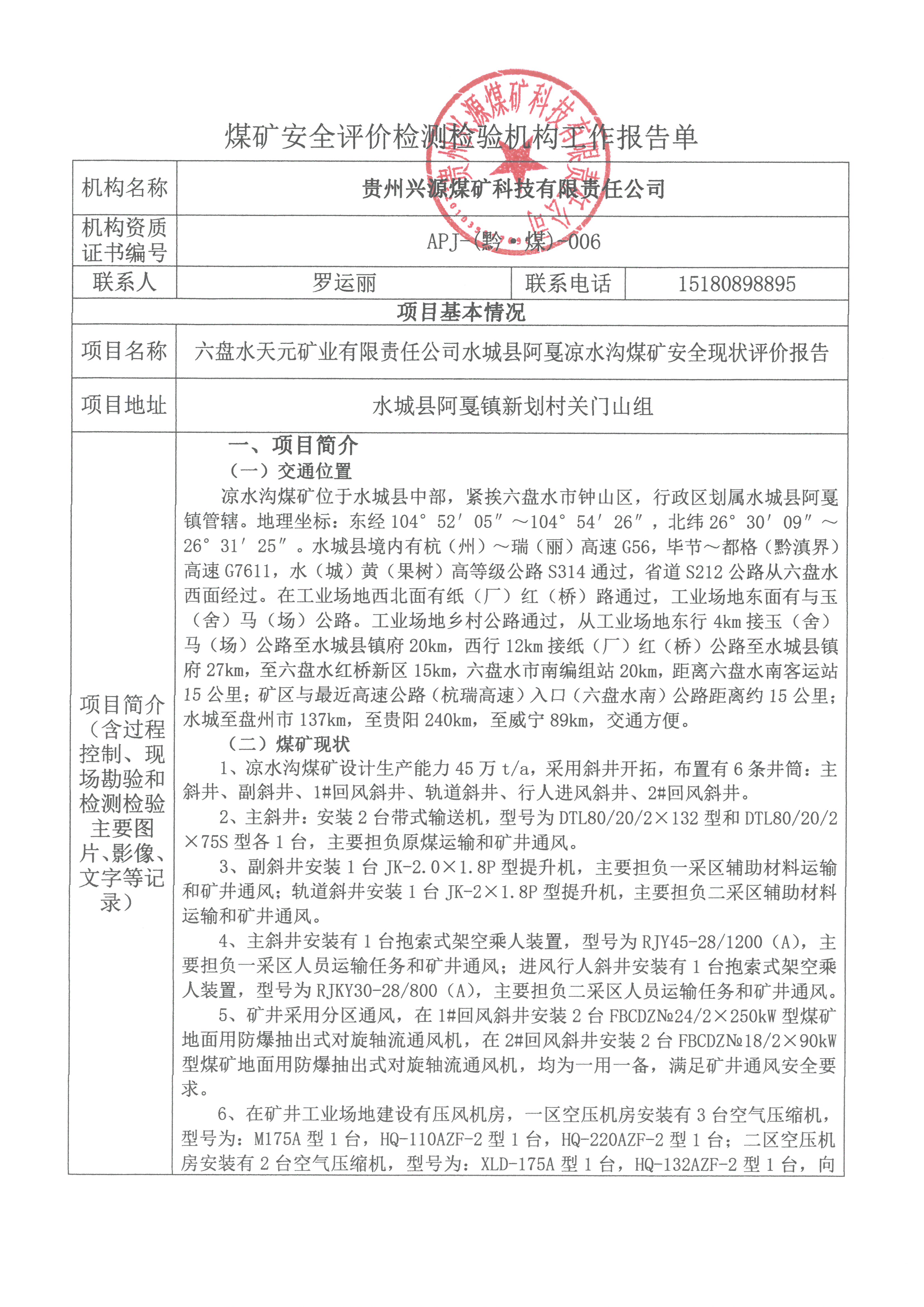 煤礦安全評價檢測檢驗機構(gòu)工作報告單【六盤水天元礦業(yè)有限責(zé)任公司水城縣阿戛涼水溝煤礦安全現(xiàn)狀評價報告】