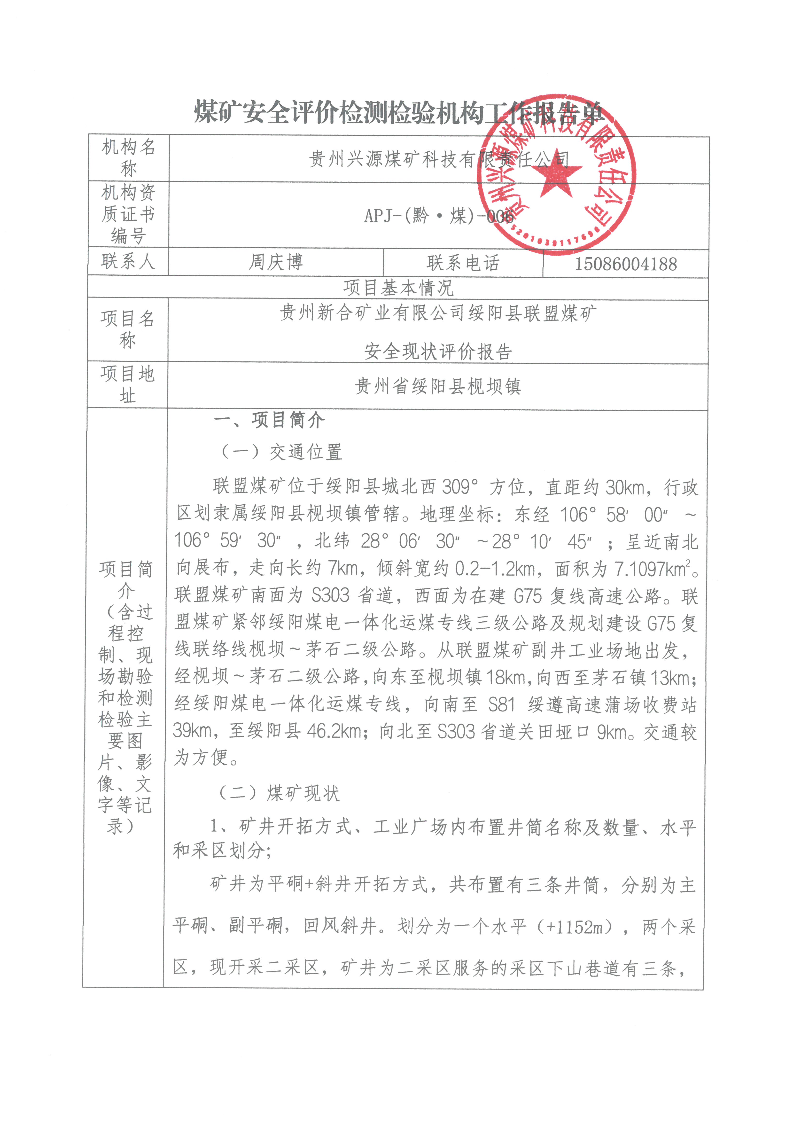 煤礦安全評(píng)價(jià)檢測(cè)檢驗(yàn)機(jī)構(gòu)工作報(bào)告單【貴州新合礦業(yè)有限公司綏陽(yáng)縣聯(lián)盟煤礦安全現(xiàn)狀評(píng)價(jià)報(bào)告】