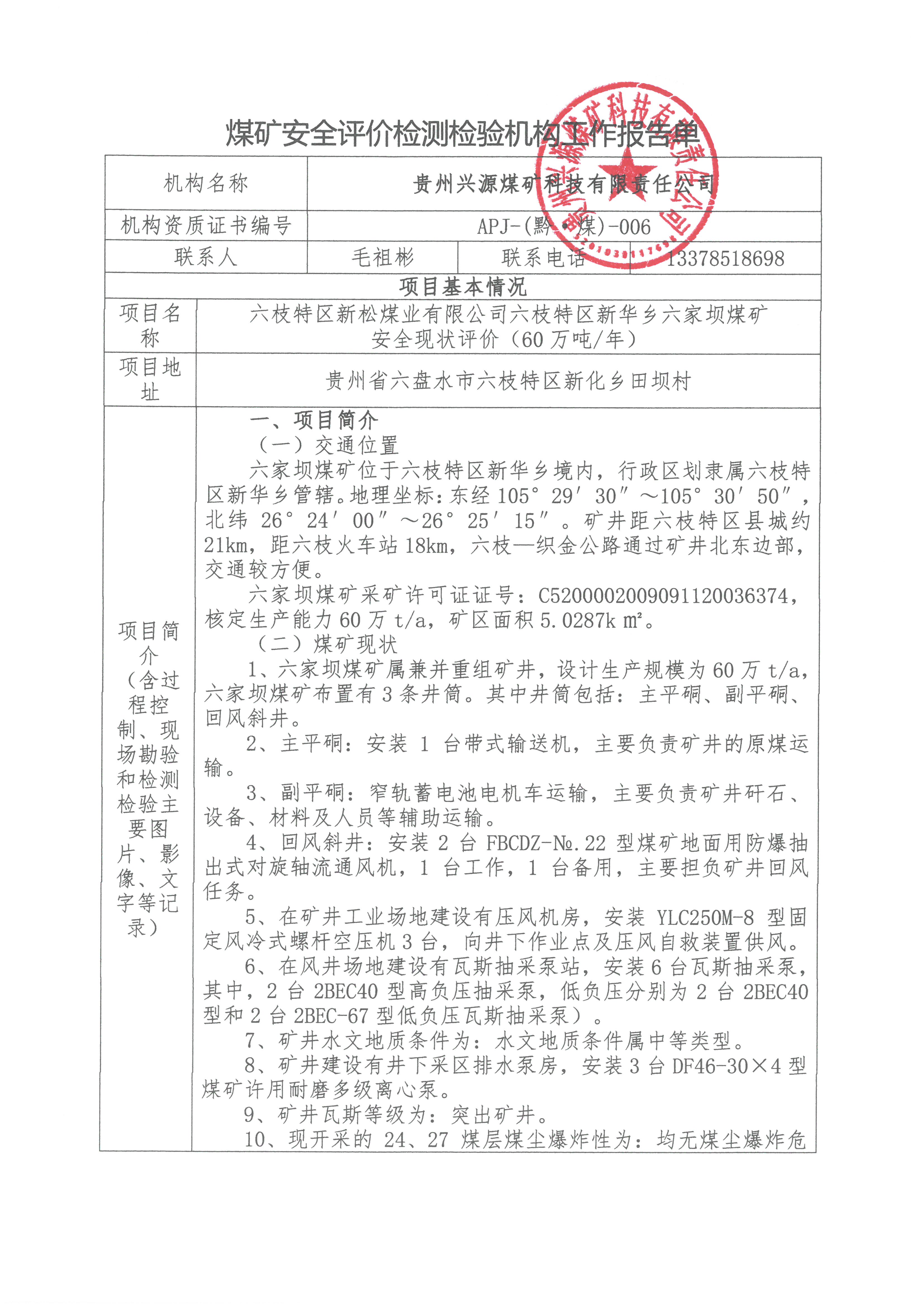 煤礦安全評(píng)價(jià)檢測(cè)檢驗(yàn)機(jī)構(gòu)工作報(bào)告單【六枝特區(qū)新松煤業(yè)有限公司六枝特區(qū)新華鄉(xiāng)六家壩煤礦安全現(xiàn)狀評(píng)價(jià)】