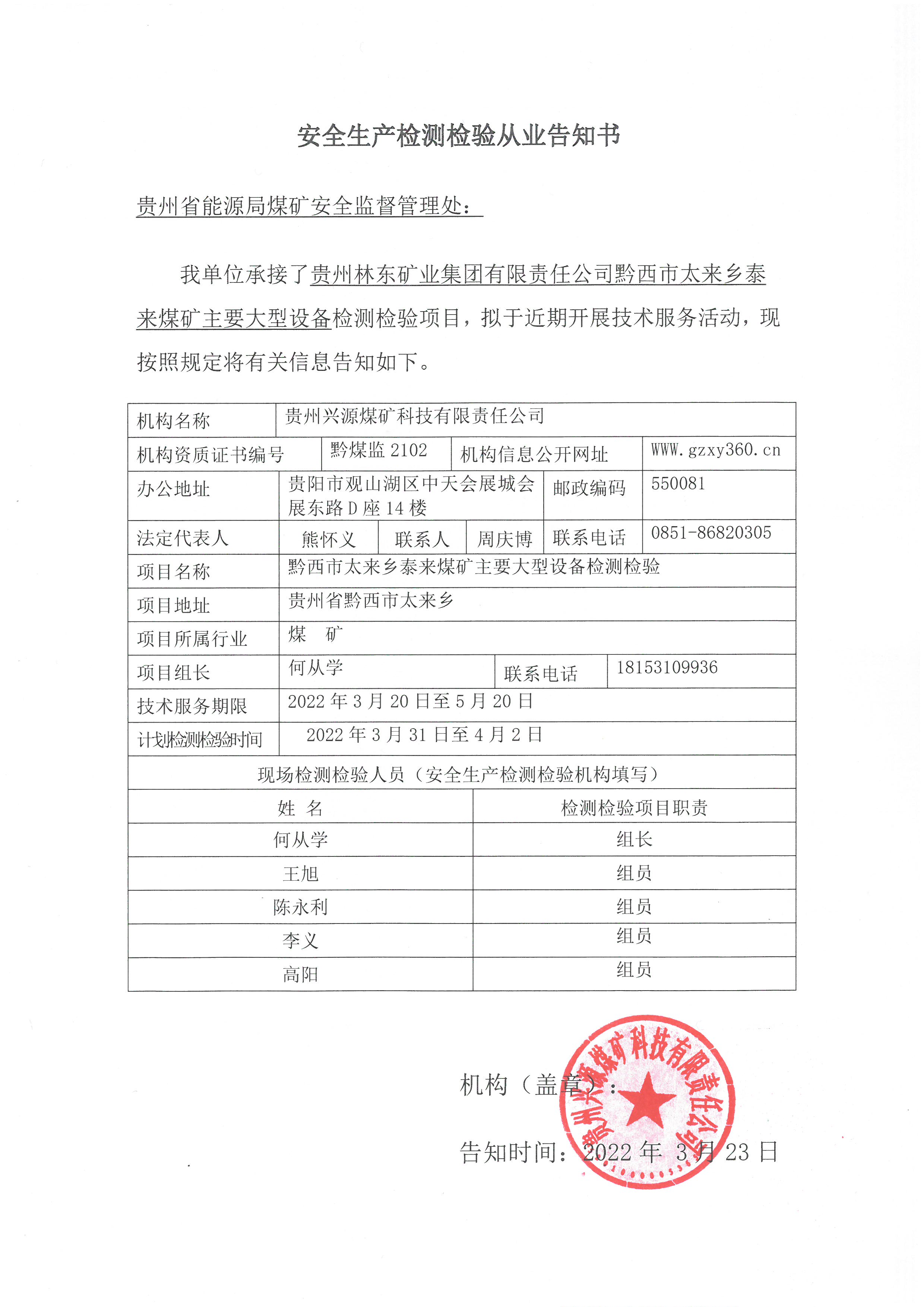安全生產檢測檢驗從業(yè)告知書【貴州林東礦業(yè)集團有限責任公司黔西市太來鄉(xiāng)泰來煤礦】