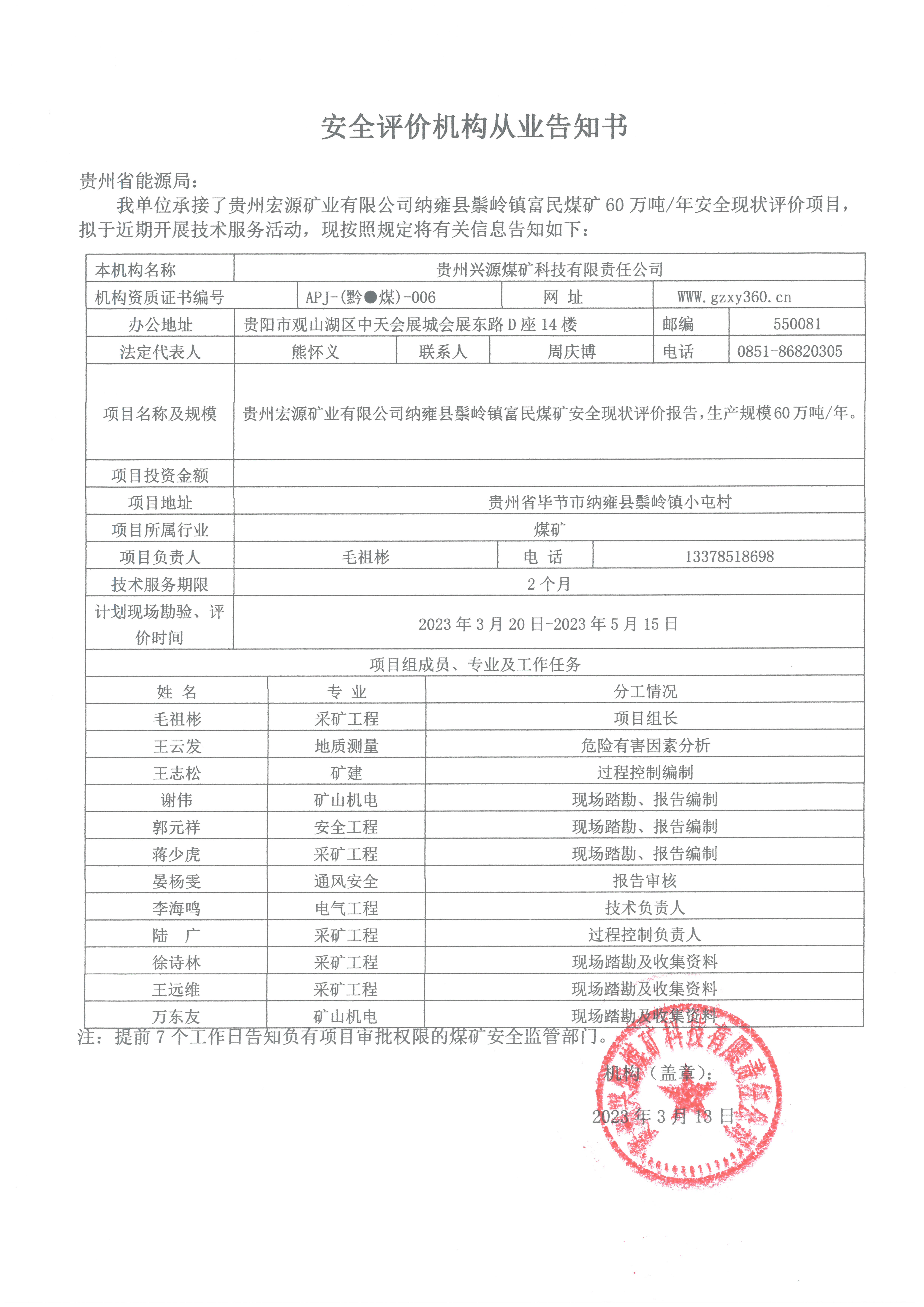 安全評價機構從業(yè)告知書【貴州宏源礦業(yè)有限公司納雍縣鬃嶺鎮(zhèn)富民煤礦】
