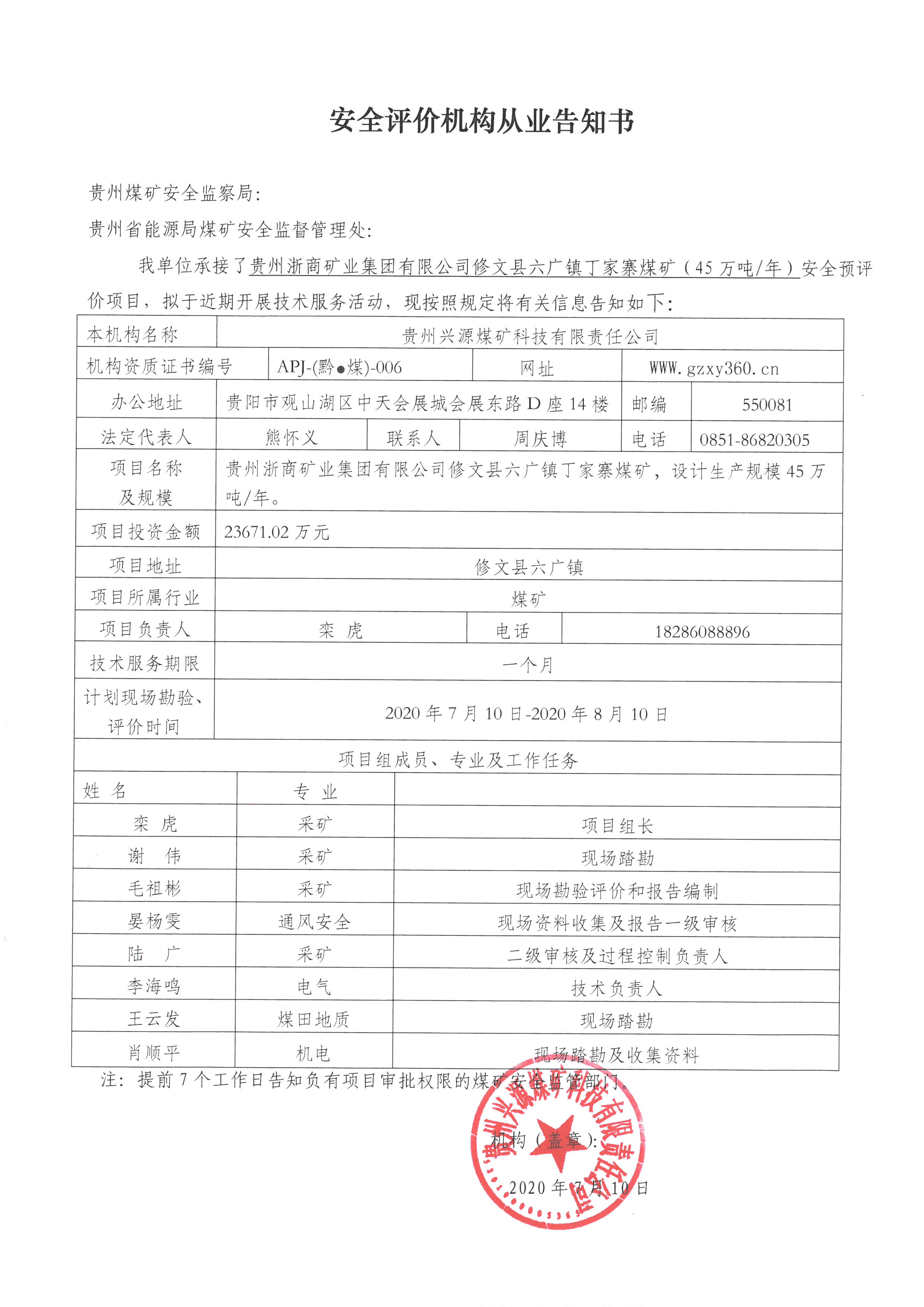 安全評價機構(gòu)從業(yè)告知書[貴州浙商礦業(yè)集團有限公司修文縣六廣鎮(zhèn)丁家寨煤礦]