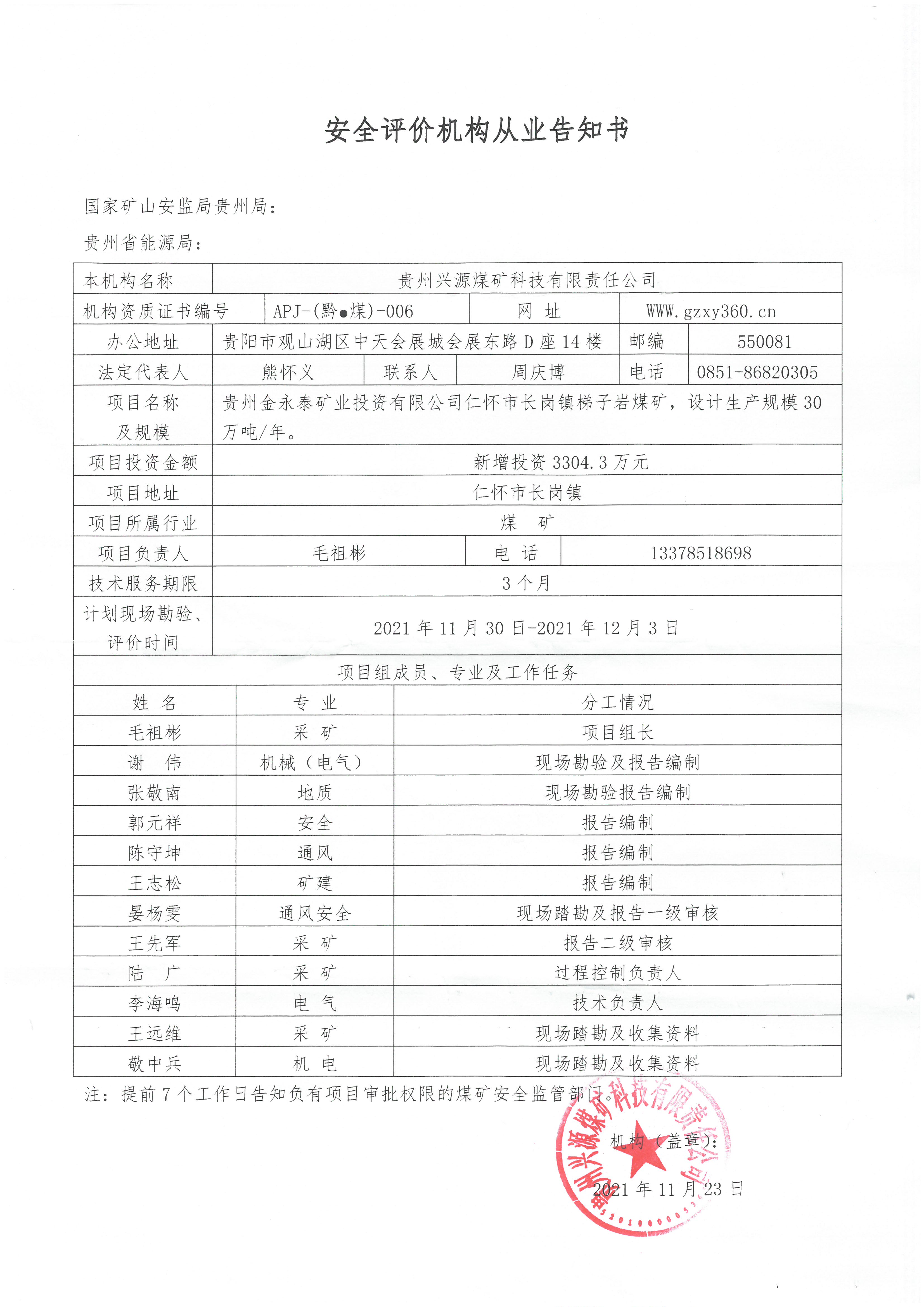 安全評價(jià)機(jī)構(gòu)從業(yè)告知書(貴州金永泰礦業(yè)投資有限公司仁懷市長崗鎮(zhèn)梯子巖煤礦)