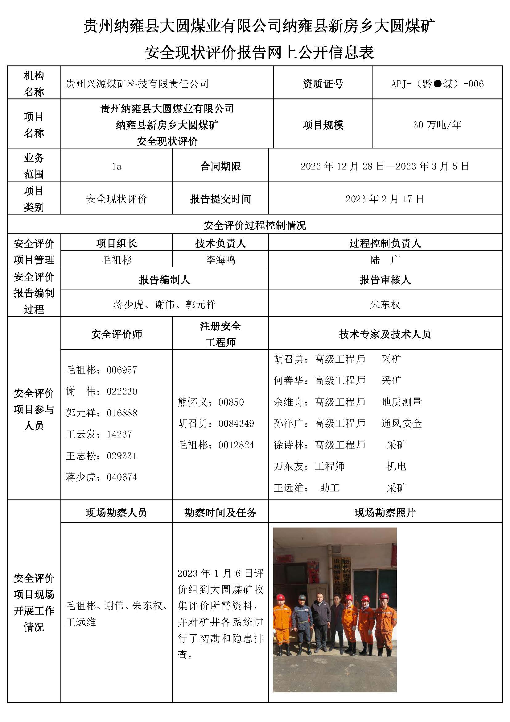 貴州納雍縣大圓煤業(yè)有限公司納雍縣新房鄉(xiāng)大圓煤礦 安全現(xiàn)狀評價(jià)報(bào)告網(wǎng)上公開信息表