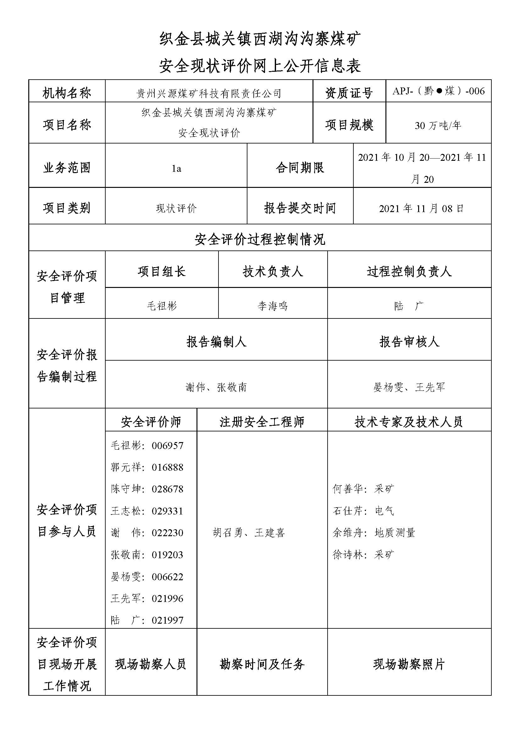 織金縣城關鎮(zhèn)西湖溝溝寨煤礦安全現(xiàn)狀評價網(wǎng)上公開信息表