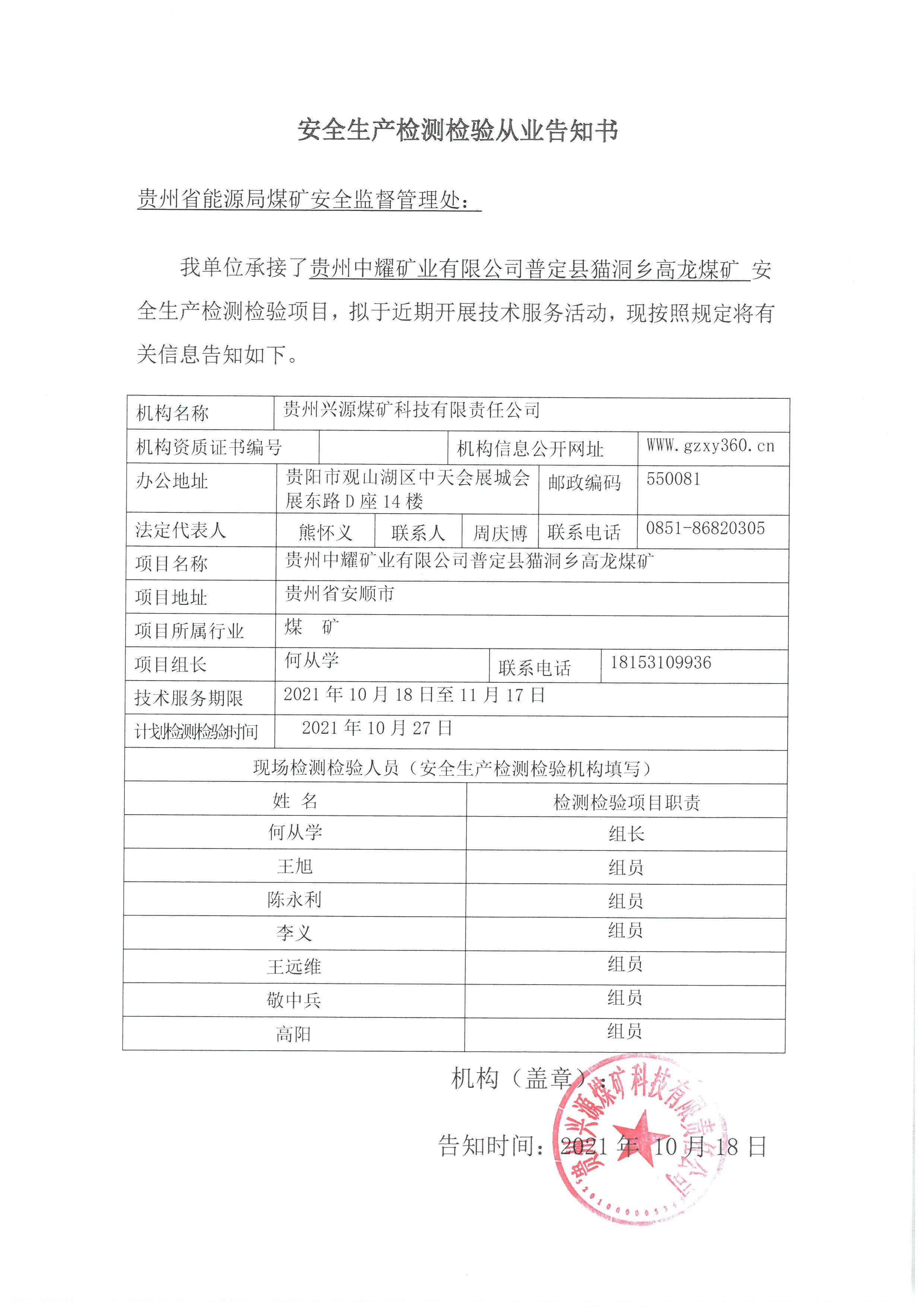 安全生產檢測檢驗從業(yè)告知書【貴州中耀礦業(yè)有限公司普定縣貓洞鄉(xiāng)高龍煤礦】