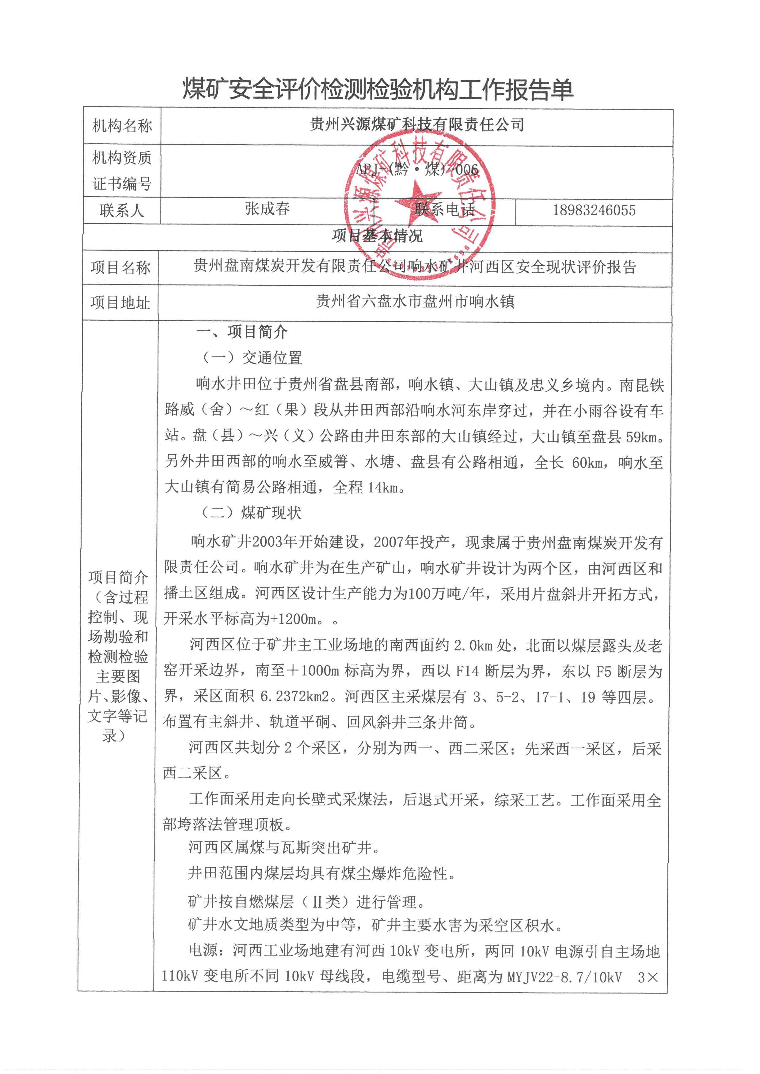 煤礦安全評價檢測檢驗機構工作報告單【貴州盤南煤炭開發(fā)有限責任公司響水礦井河西區(qū)安全現(xiàn)狀評價報告】