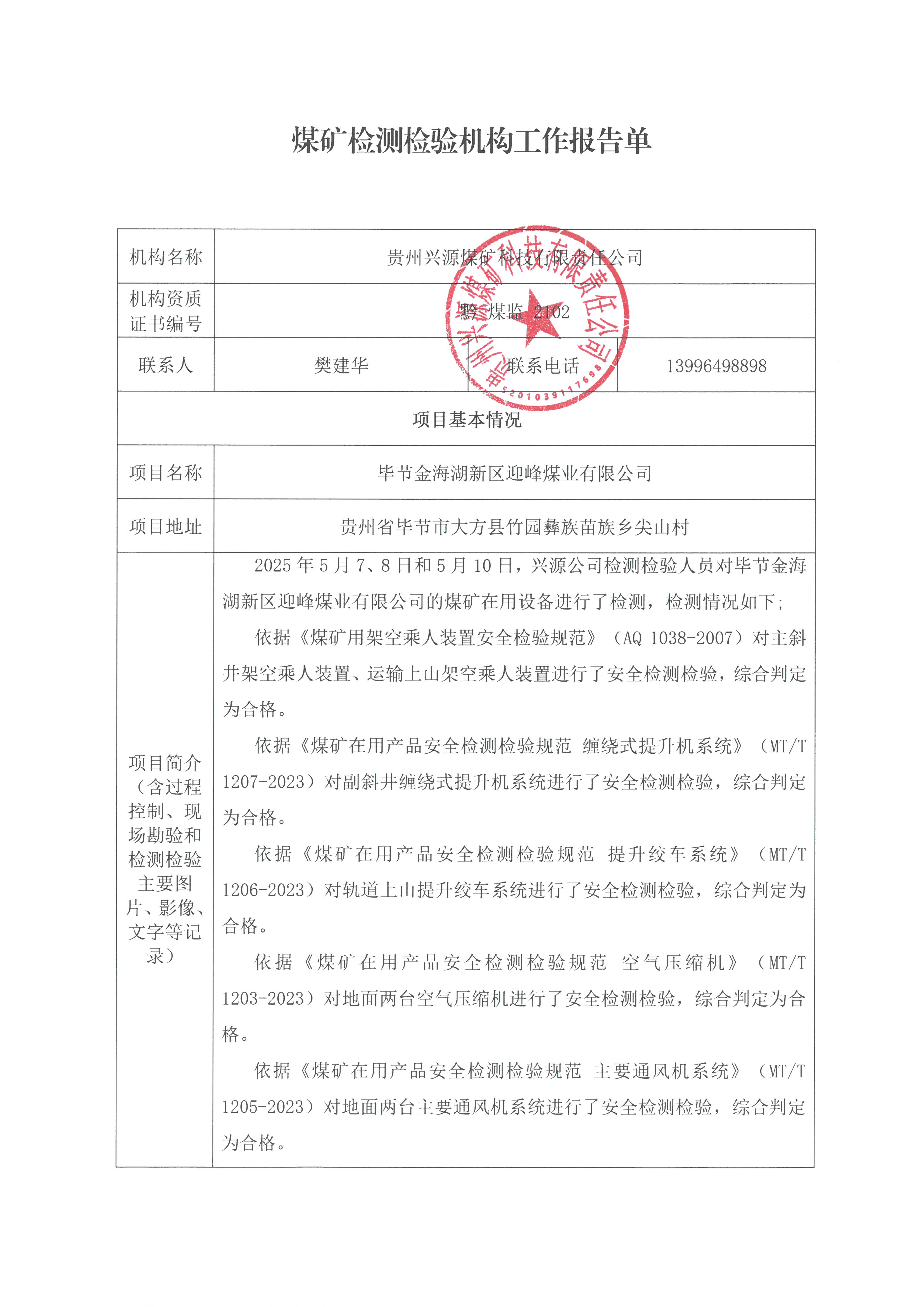 煤礦檢測(cè)檢驗(yàn)機(jī)構(gòu)工作報(bào)告單【畢節(jié)金海湖新區(qū)迎峰煤業(yè)有限公司】