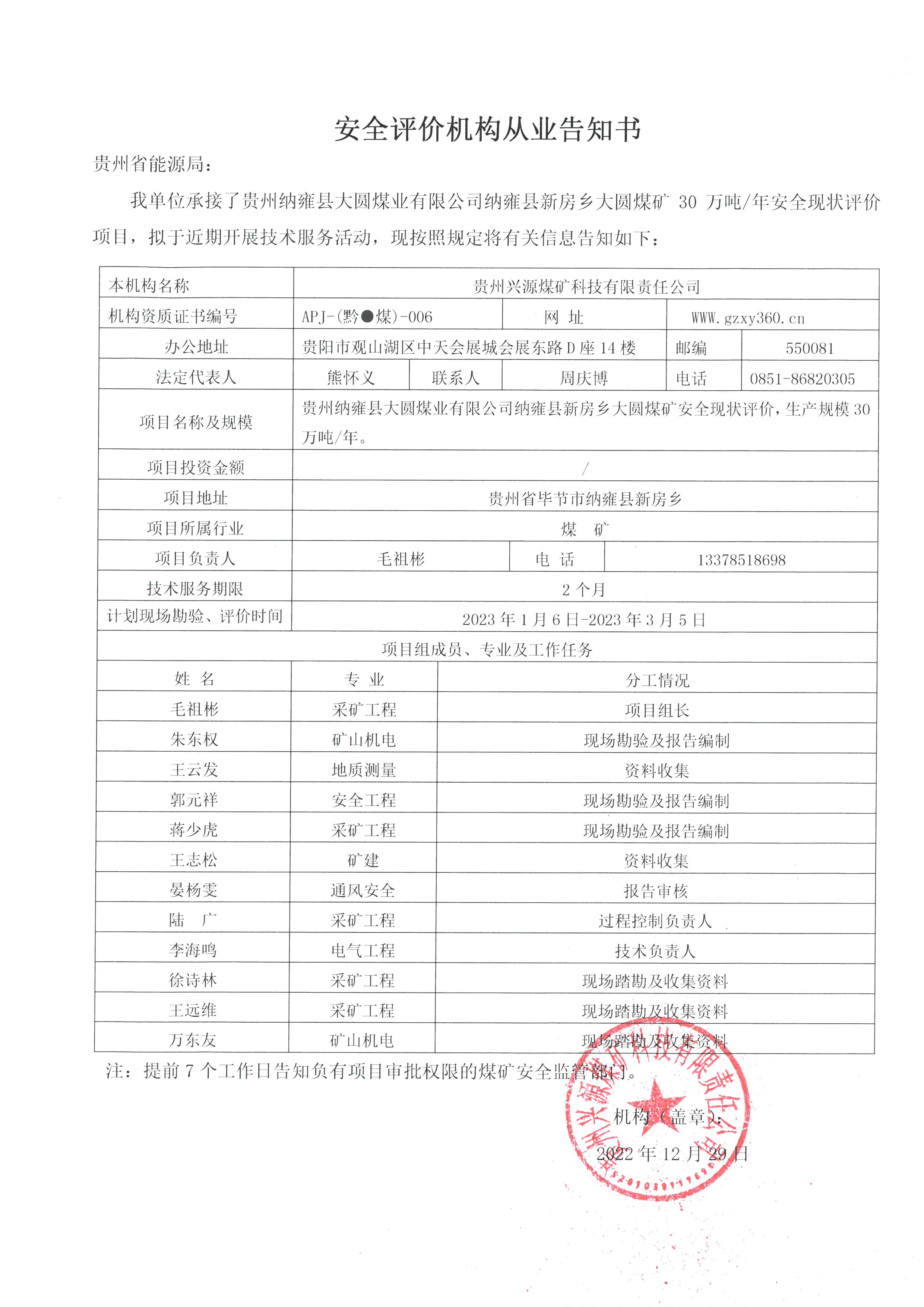 安全評(píng)價(jià)機(jī)構(gòu)從業(yè)告知書【貴州納雍縣大圓煤業(yè)有限公司納雍縣新房鄉(xiāng)大圓煤礦】