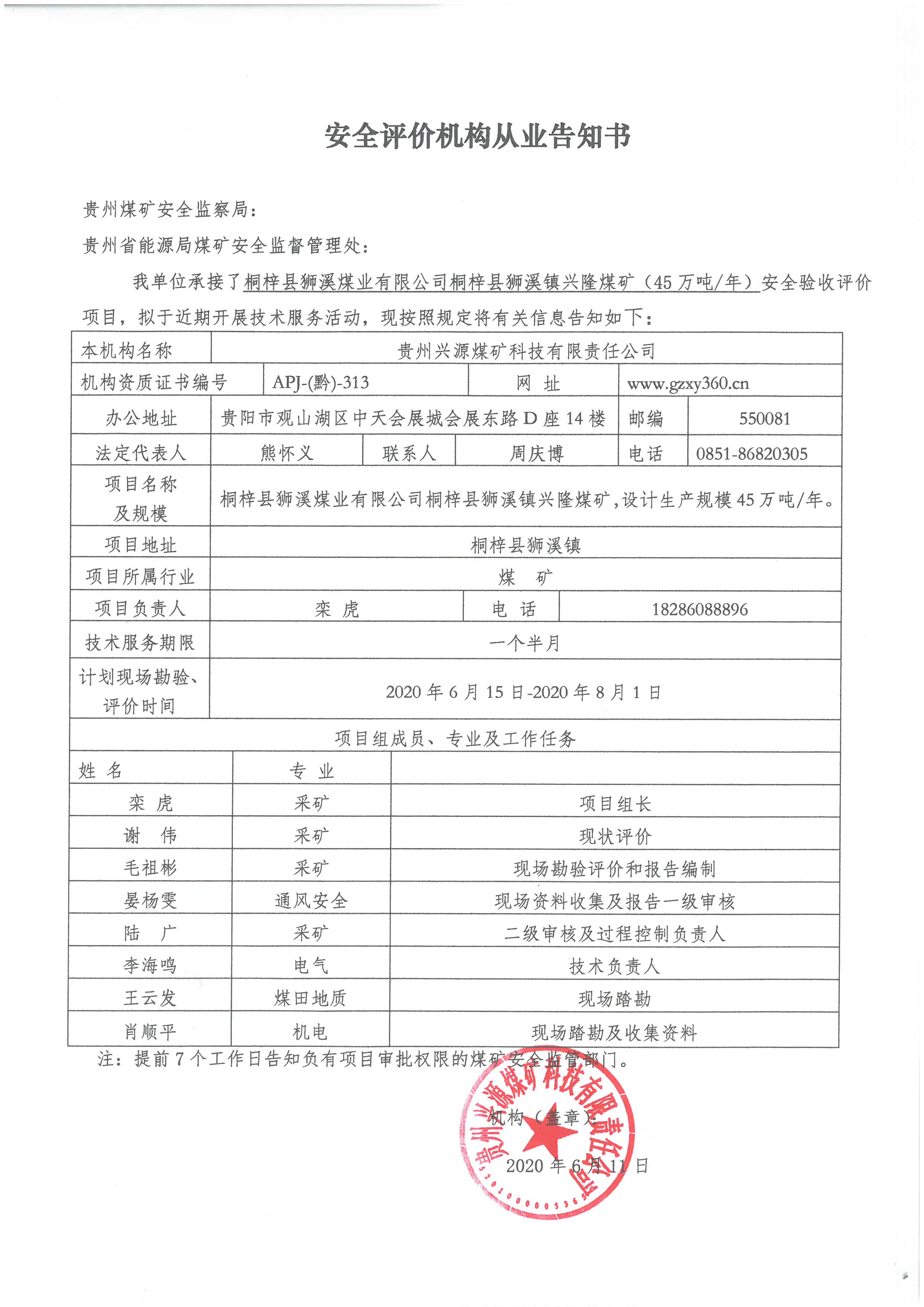 安全評價(jià)機(jī)構(gòu)從業(yè)告知書【桐梓縣獅溪煤業(yè)有限公司桐梓縣獅溪鎮(zhèn)興隆煤礦(45萬噸/年)安全驗(yàn)收評價(jià)】