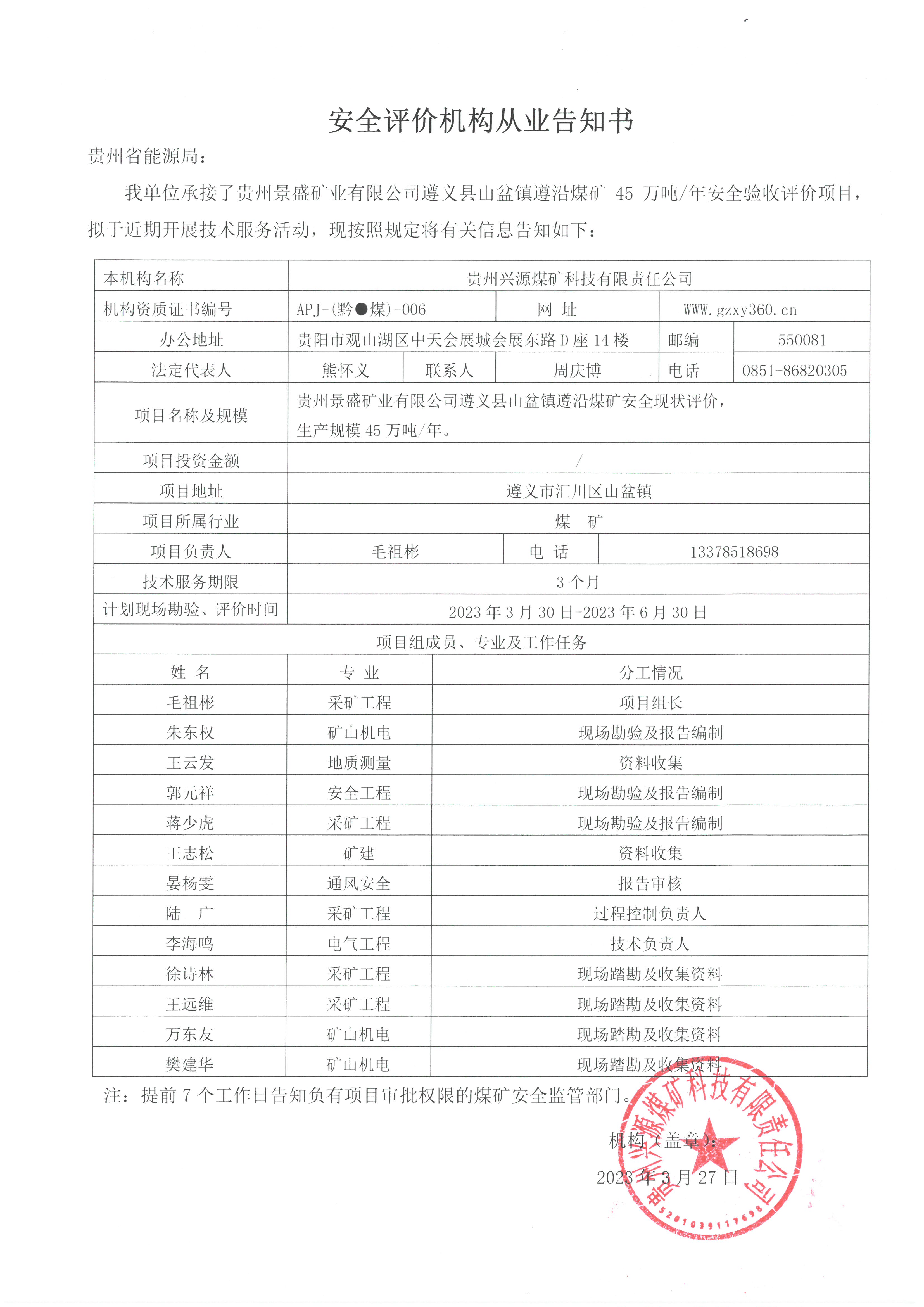 安全評價機構(gòu)從業(yè)告知書【貴州景盛礦業(yè)有限公司遵義縣山盆鎮(zhèn)遵沿煤礦】