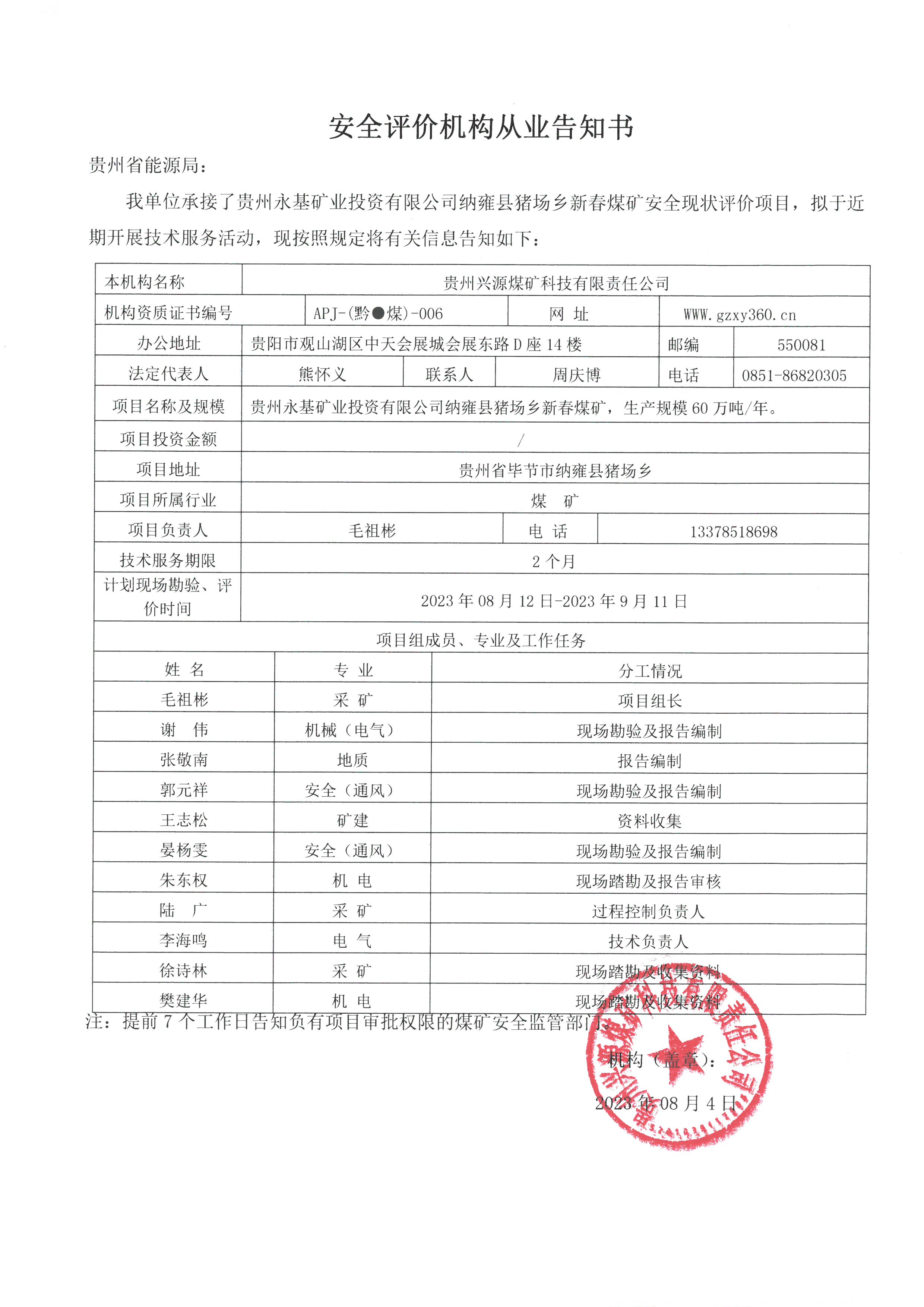 安全評(píng)價(jià)機(jī)構(gòu)從業(yè)告知書【貴州永基礦業(yè)投資有限公司納雍縣豬場鄉(xiāng)新春煤礦】