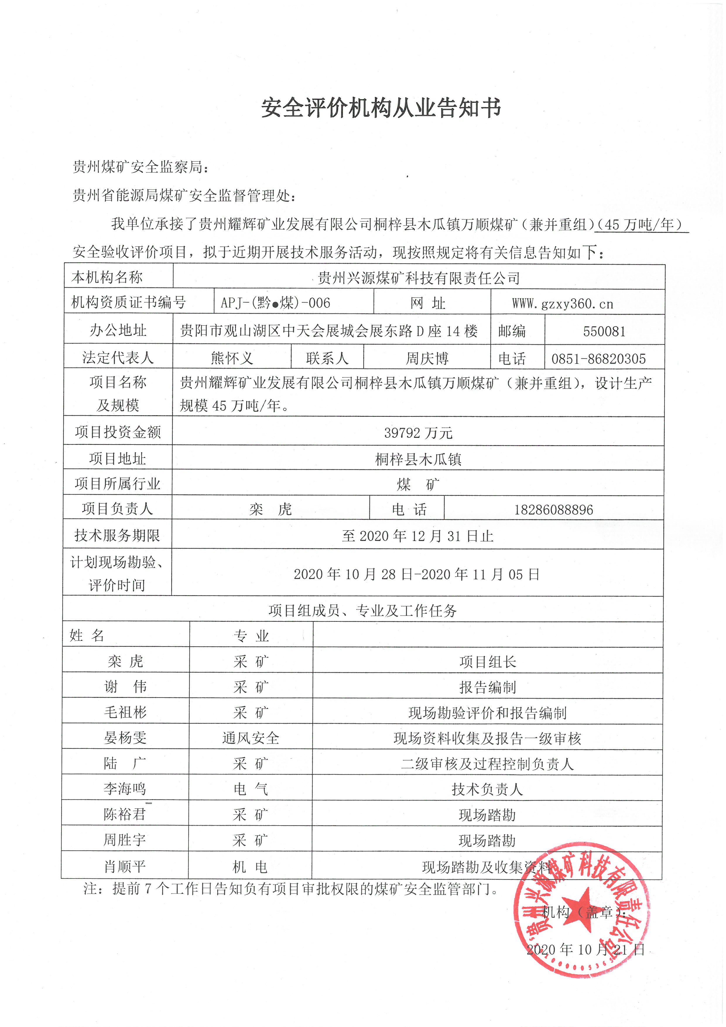 安全評價機構(gòu)從業(yè)告知書(貴州耀輝礦業(yè)發(fā)展有限公司桐梓縣木瓜鎮(zhèn)萬順煤礦)