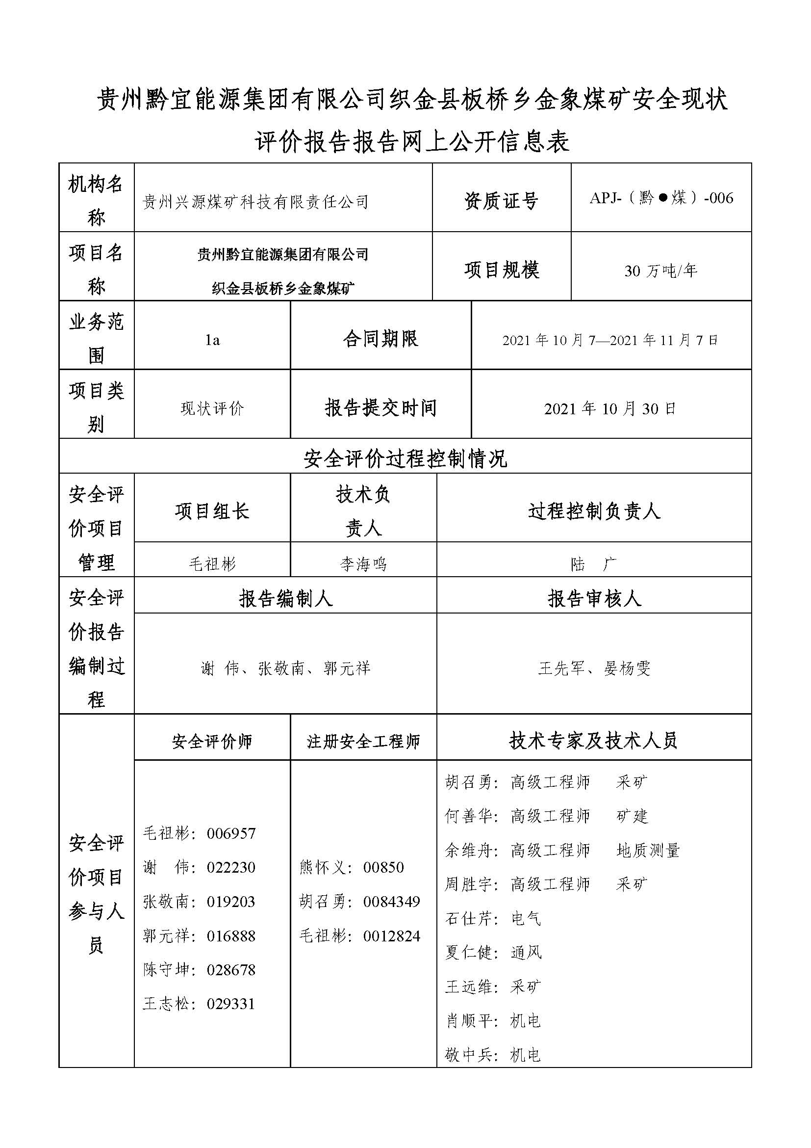 貴州黔宜能源集團(tuán)有限公司織金縣板橋鄉(xiāng)金象煤礦安全現(xiàn)狀評價(jià)報(bào)告報(bào)告網(wǎng)上公開信息表