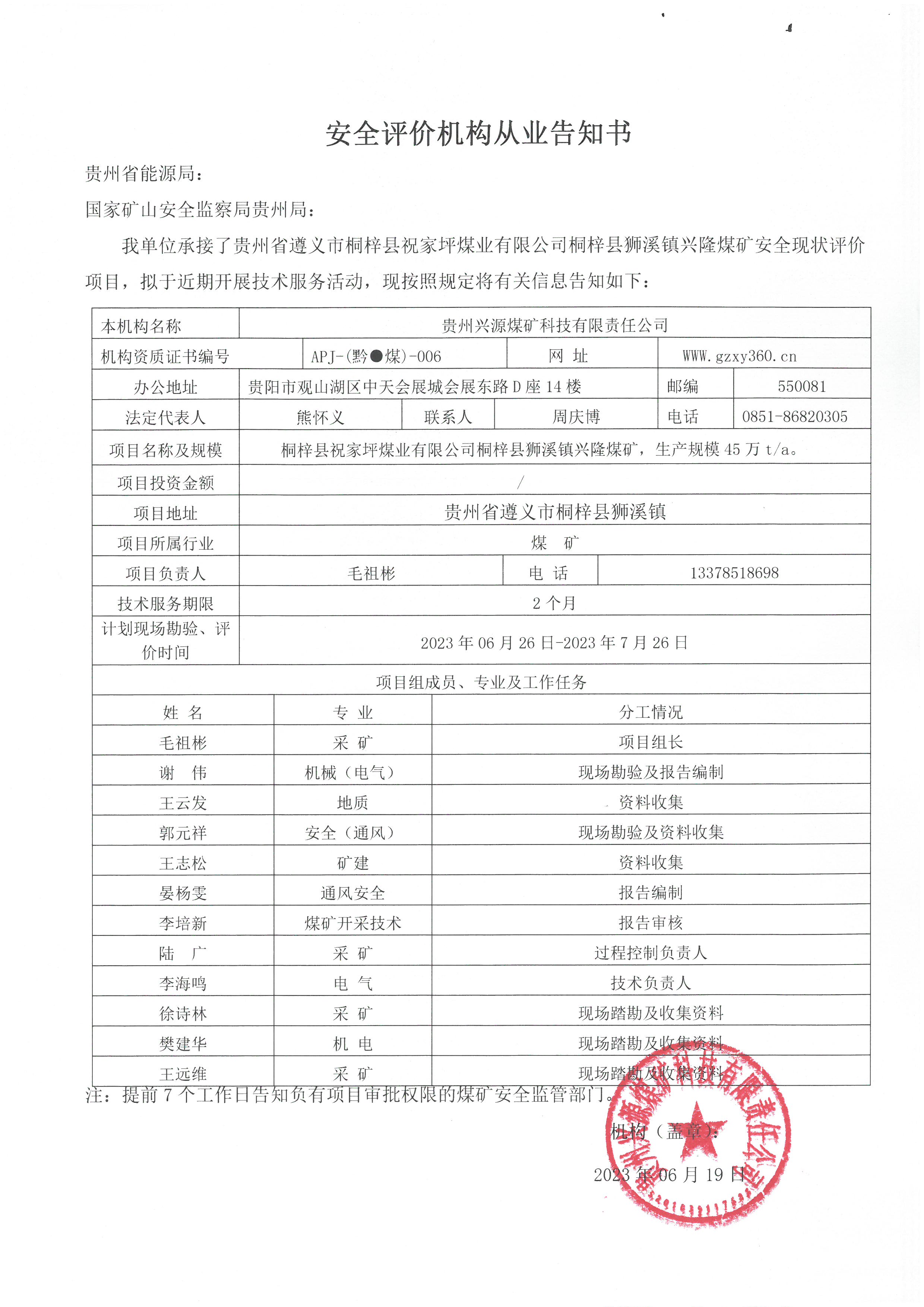 【安全評(píng)價(jià)機(jī)構(gòu)從業(yè)告知書】貴州省遵義市桐梓縣祝家坪煤業(yè)有限公司桐梓縣獅溪鎮(zhèn)興隆煤礦安全現(xiàn)狀評(píng)價(jià)