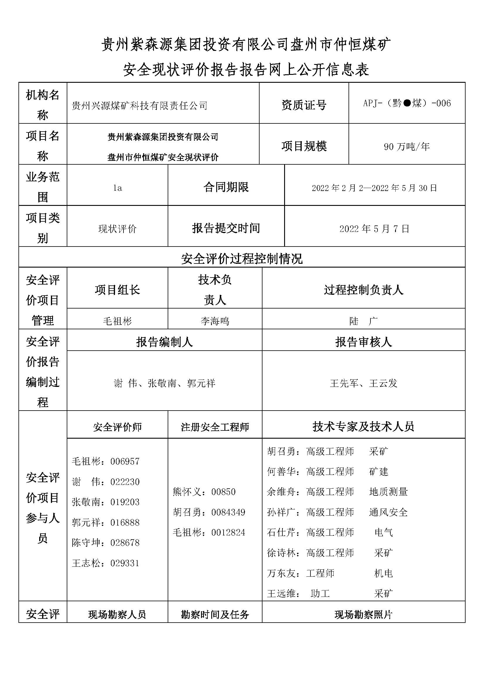 貴州紫森源集團(tuán)投資有限公司盤州市仲恒煤礦安全現(xiàn)狀評價(jià)報(bào)告報(bào)告網(wǎng)上公開信息表