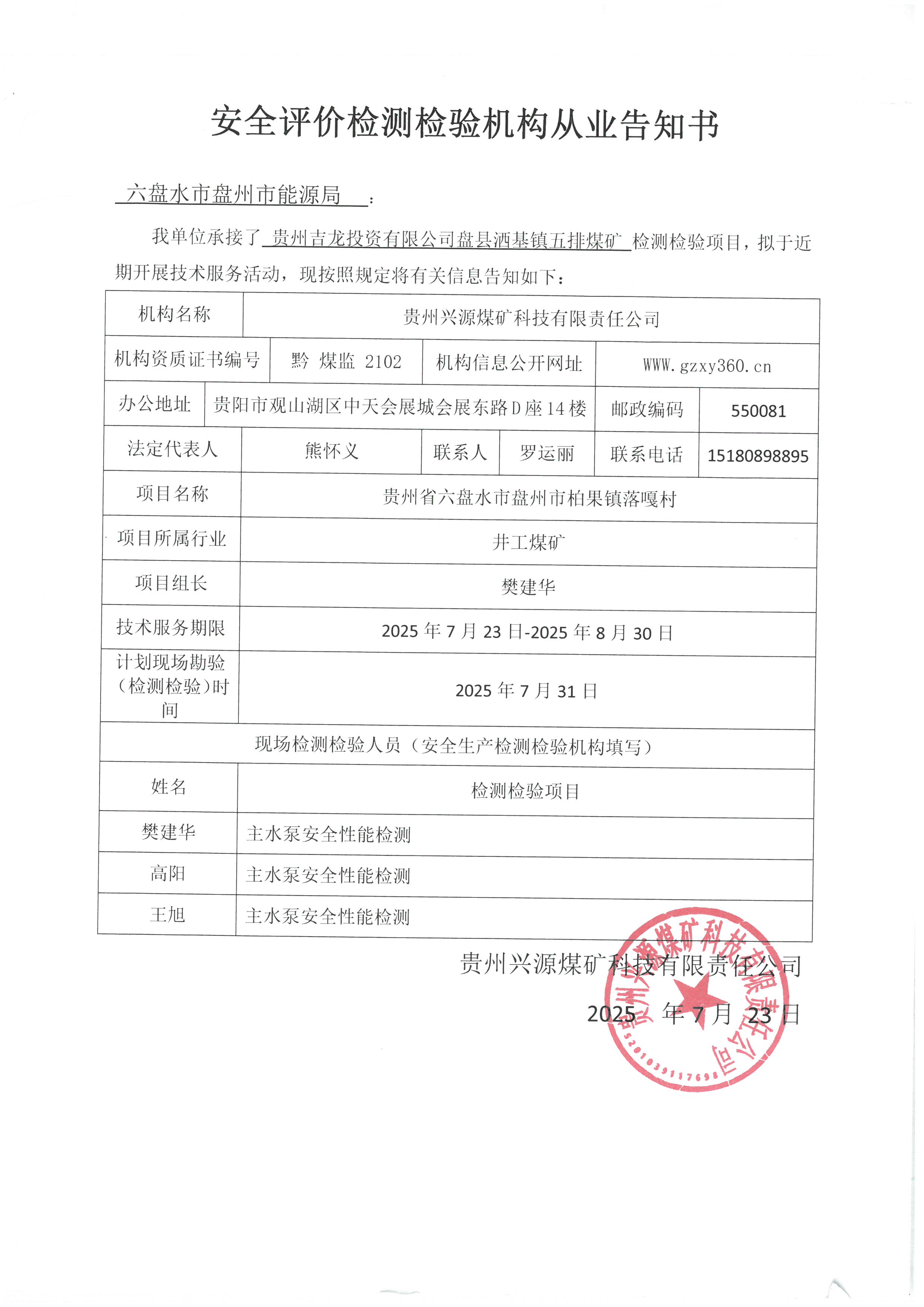 安全評價(jià)檢測檢驗(yàn)機(jī)構(gòu)從業(yè)告知書[貴州吉龍投資有限公司盤縣灑基鎮(zhèn)五排煤礦]
