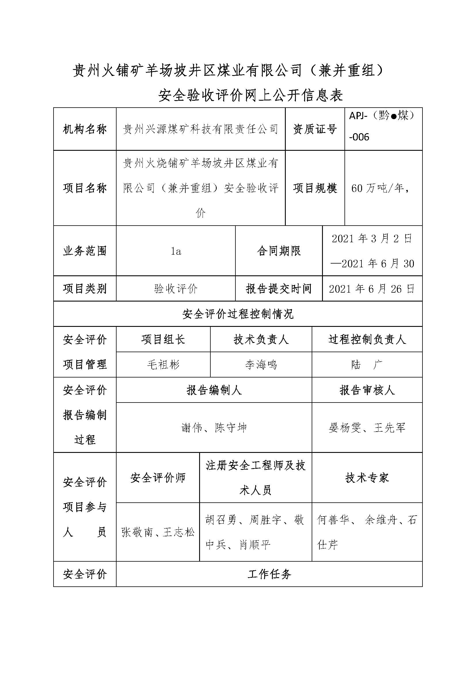 貴州火鋪礦羊場(chǎng)坡井區(qū)煤業(yè)有限公司(兼并重組)安全驗(yàn)收評(píng)價(jià)網(wǎng)上公開(kāi)信息表