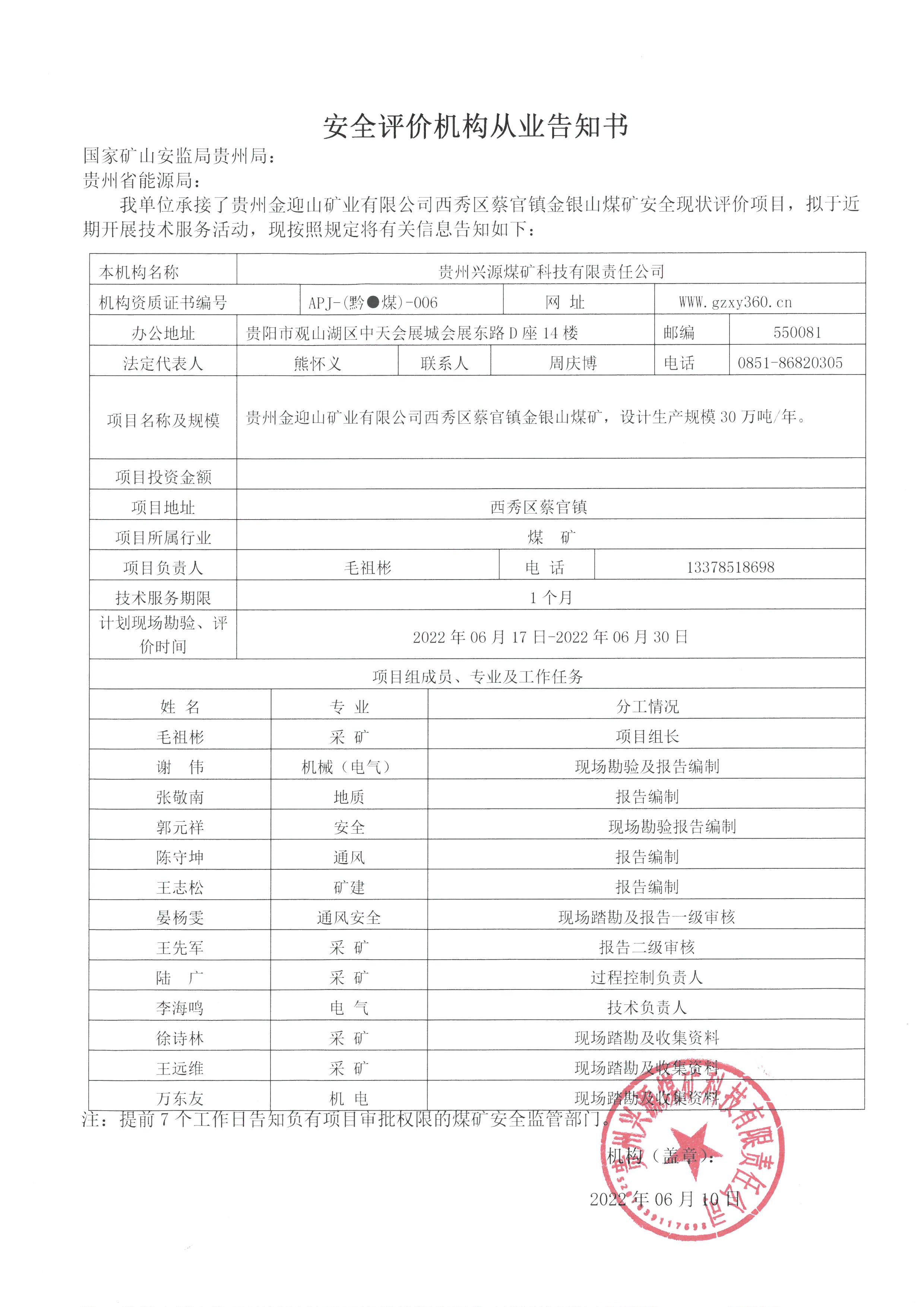 安全評價機(jī)構(gòu)從業(yè)告知書(貴州金迎山礦業(yè)有限公司西秀區(qū)蔡官鎮(zhèn)金銀山煤礦安全現(xiàn)狀評價)