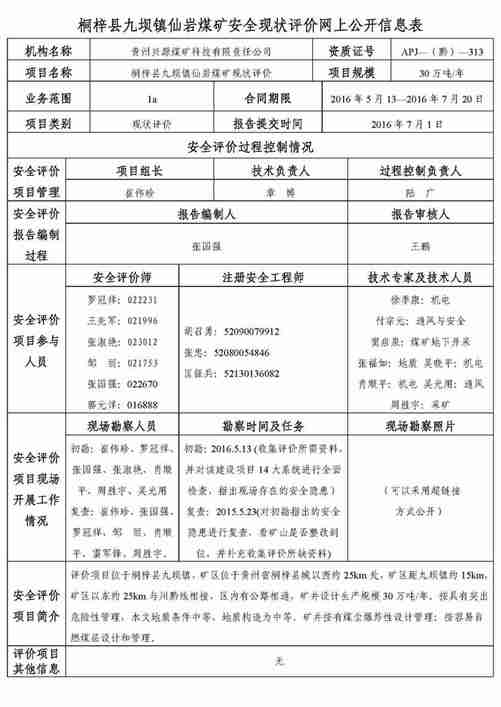 桐梓縣九壩鎮(zhèn)仙巖煤礦安全現(xiàn)狀評(píng)價(jià)網(wǎng)上公開信息表