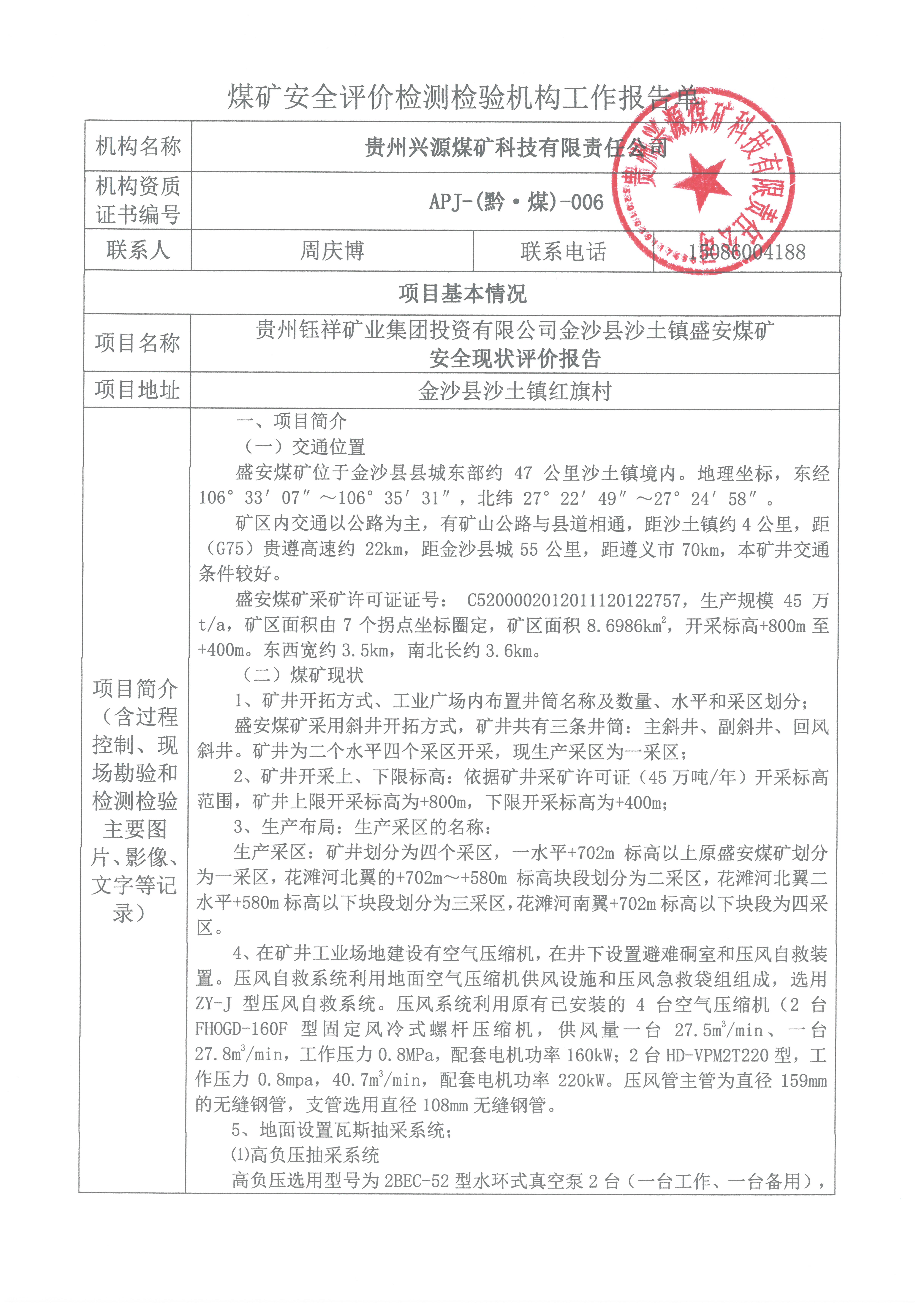 煤礦安全評價檢測檢驗機構(gòu)工作報告單【貴州鈺祥礦業(yè)集團(tuán)投資有限公司金沙縣沙土鎮(zhèn)盛安煤礦 安全現(xiàn)狀評價報告】