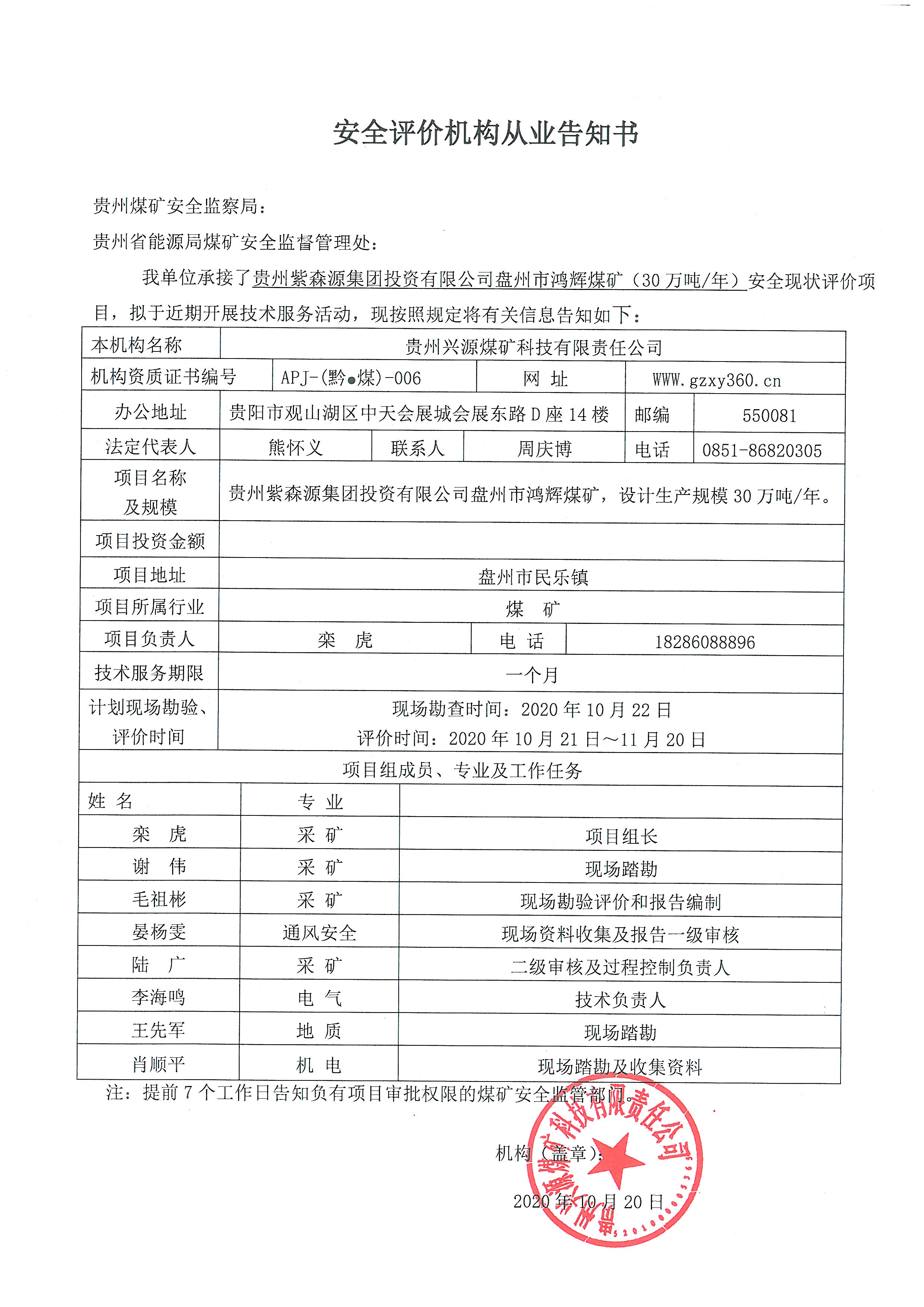 安全評價機(jī)構(gòu)從業(yè)告知書(貴州紫森源集團(tuán)投資有限公司盤州市鴻輝煤礦)