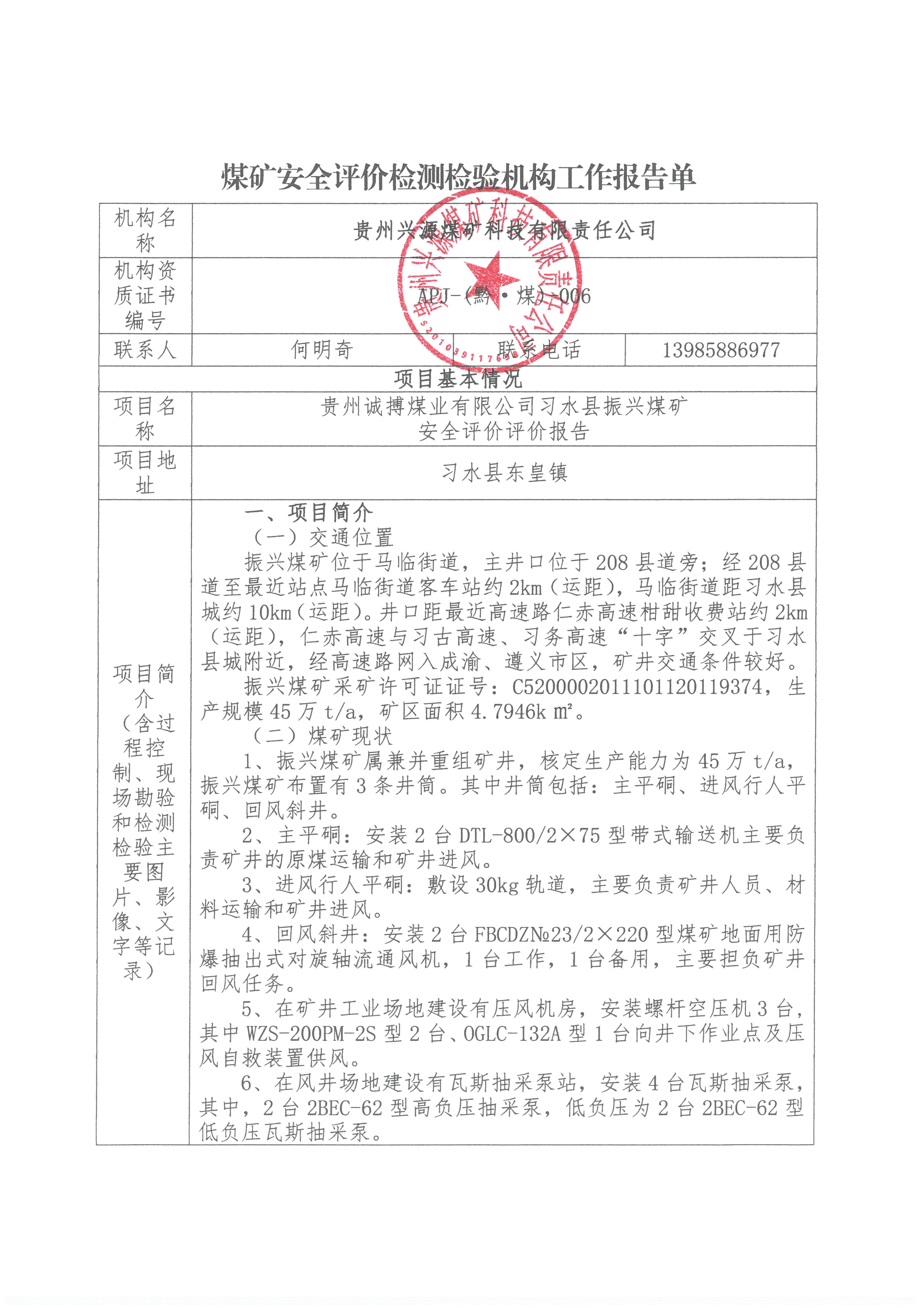 煤礦安全評價檢測檢驗(yàn)機(jī)構(gòu)工作報(bào)告單【貴州誠搏煤業(yè)有限公司習(xí)水縣振興煤礦安全評價評價報(bào)告】