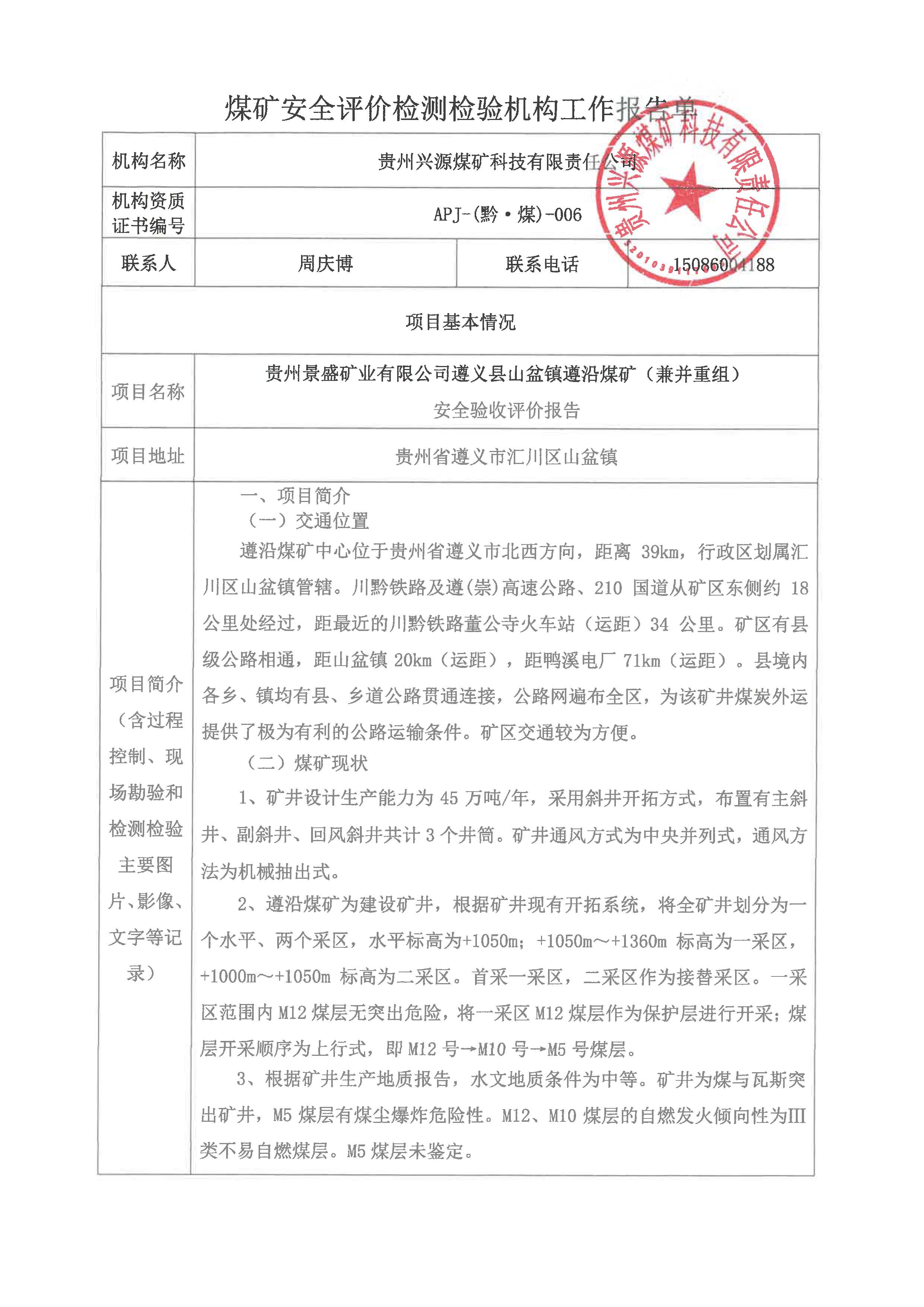 煤礦安全評(píng)價(jià)檢測(cè)檢驗(yàn)機(jī)構(gòu)工作報(bào)告單【貴州景盛礦業(yè)有限公司遵義縣山盆鎮(zhèn)遵沿煤礦(兼并重組) 安全驗(yàn)收評(píng)價(jià)報(bào)告】