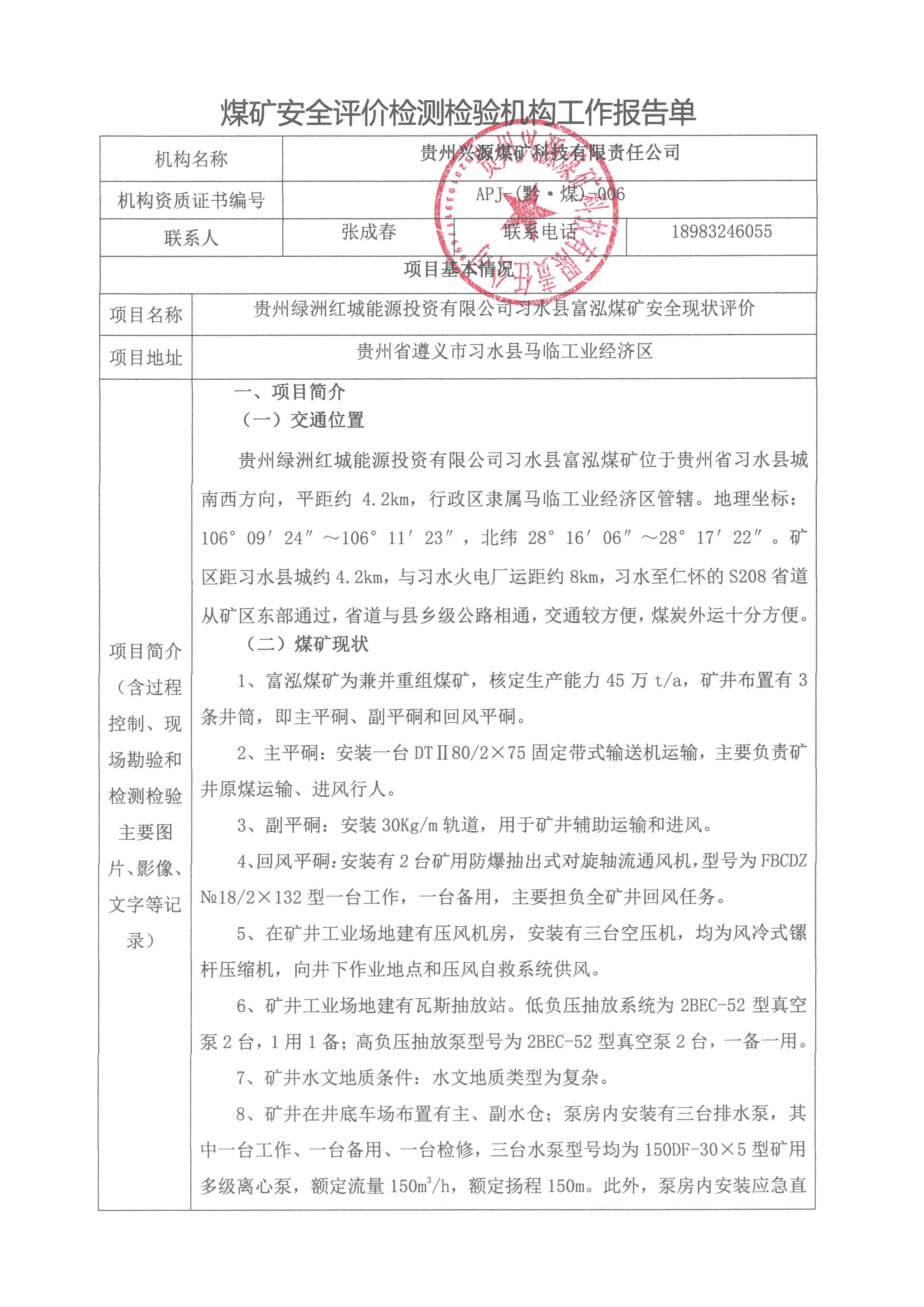 煤礦安全評(píng)價(jià)檢測(cè)檢驗(yàn)機(jī)構(gòu)工作報(bào)告單【貴州綠洲紅城能源投資有限公司習(xí)水縣富泓煤礦安全現(xiàn)狀評(píng)價(jià)】