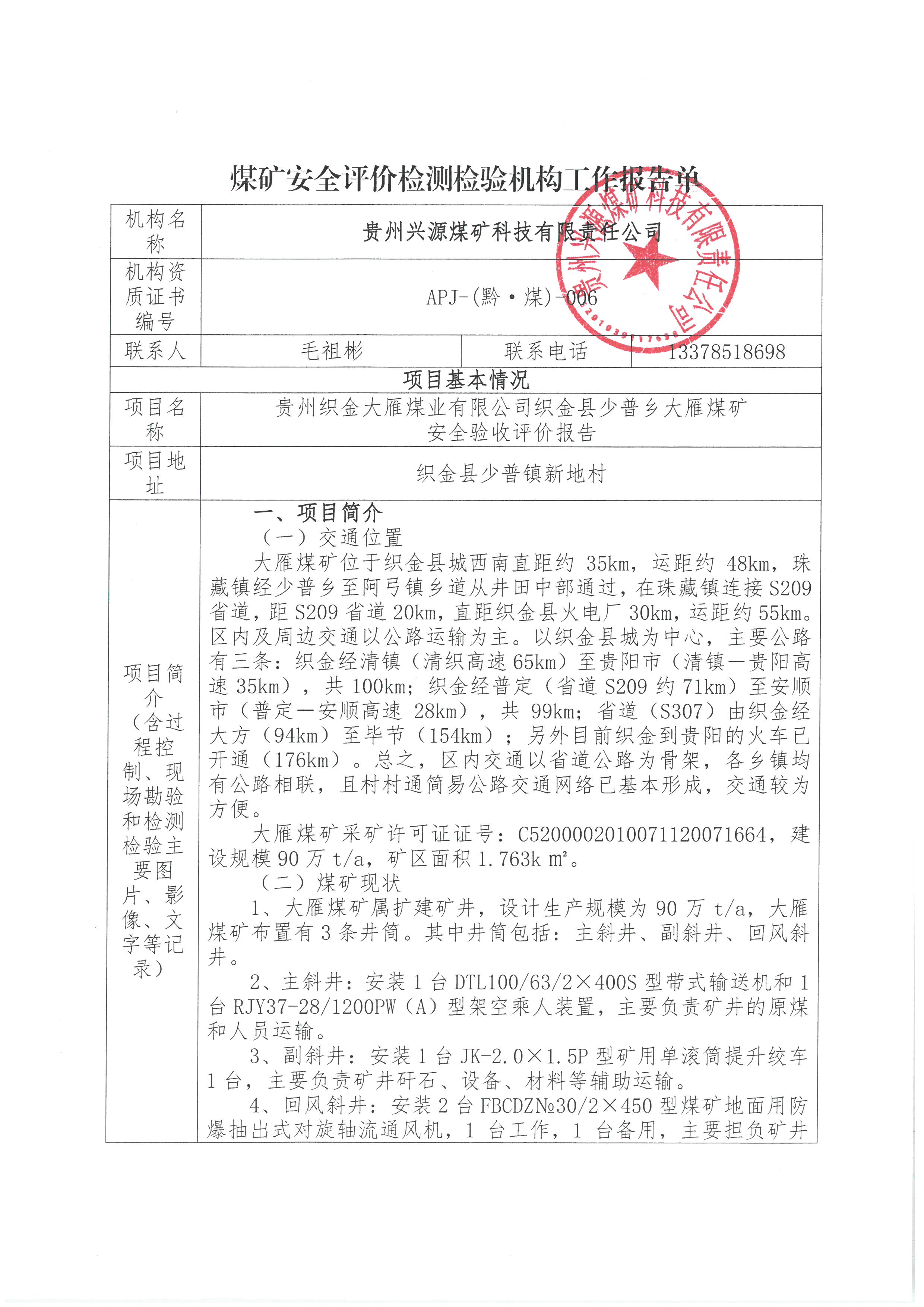 煤礦安全評(píng)價(jià)檢測(cè)檢驗(yàn)機(jī)構(gòu)工作報(bào)告單【貴州織金大雁煤業(yè)有限公司織金縣少普鄉(xiāng)大雁煤礦安全驗(yàn)收評(píng)價(jià)報(bào)告】