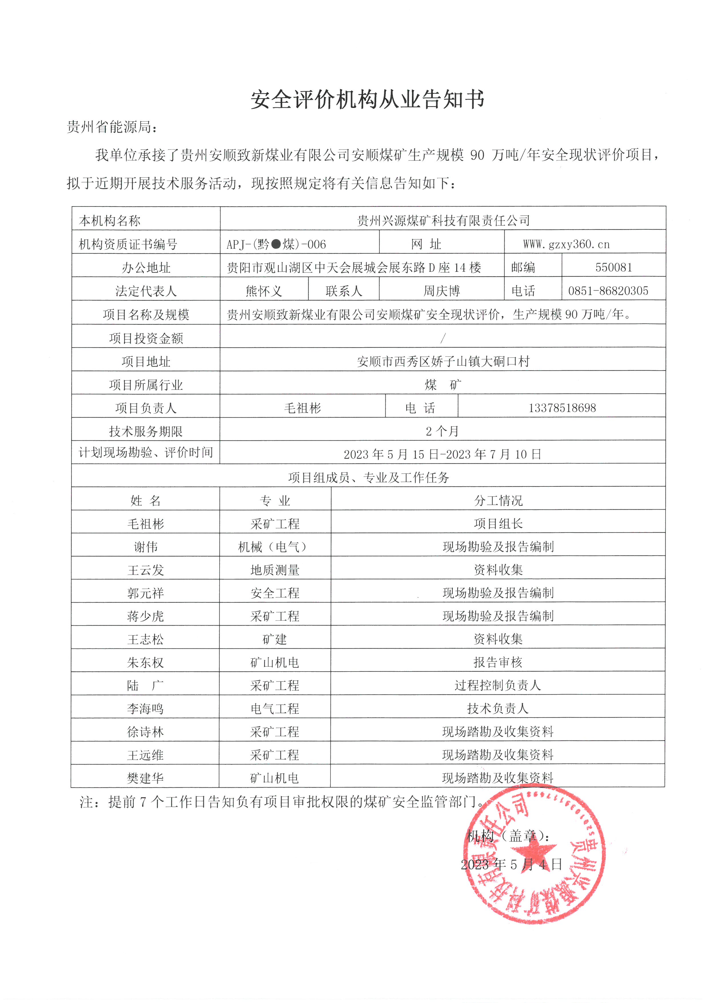 安全評(píng)價(jià)機(jī)構(gòu)從業(yè)告知書【貴州安順致新煤業(yè)有限公司安順煤礦】