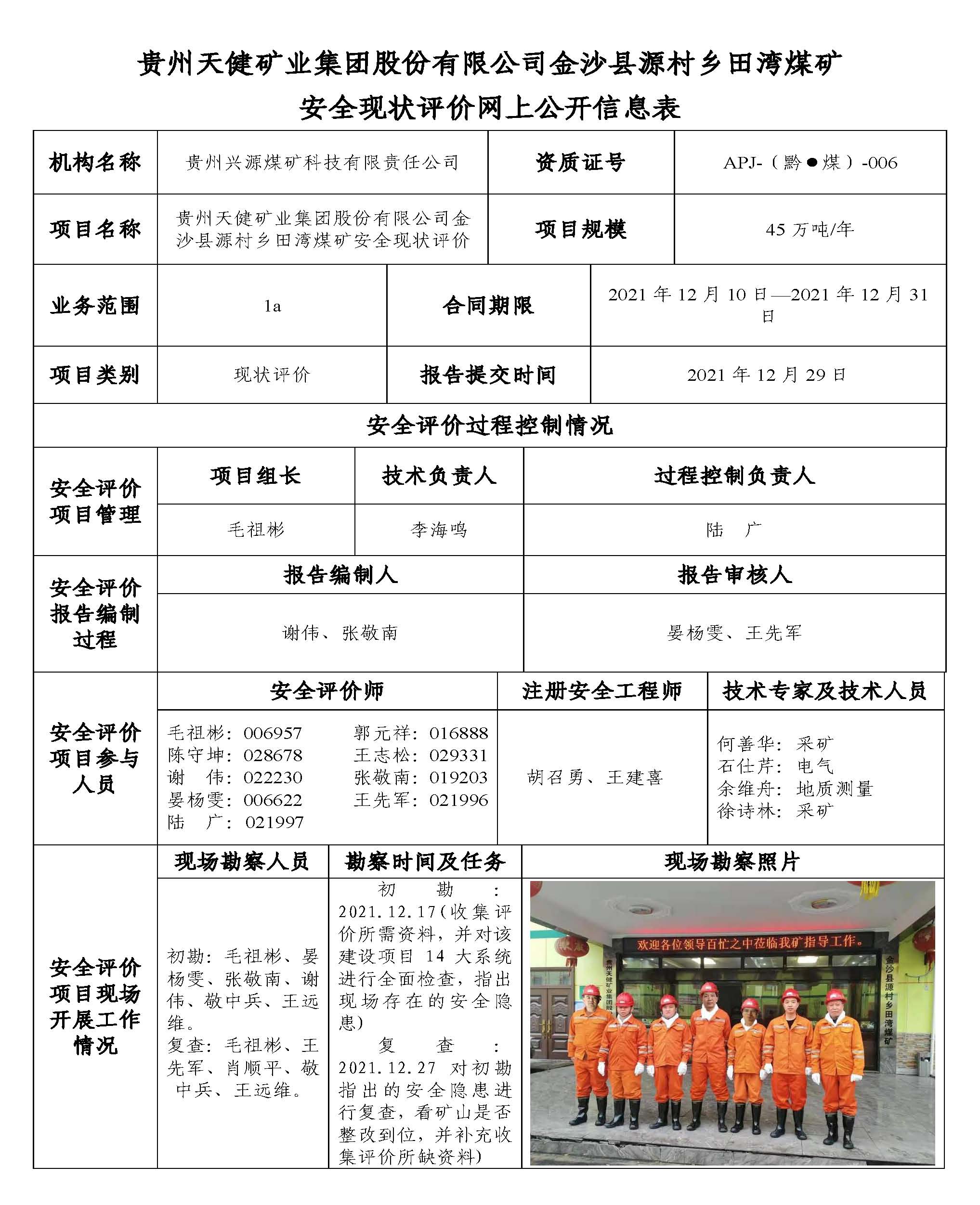 貴州天健礦業(yè)集團股份有限公司金沙縣源村鄉(xiāng)田灣煤礦安全現(xiàn)狀評價網上公開信息表