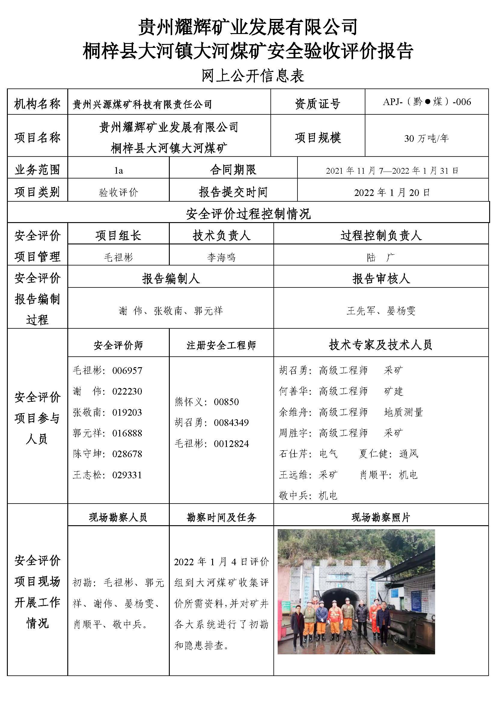 貴州耀輝礦業(yè)發(fā)展有限公司桐梓縣大河鎮(zhèn)大河煤礦安全驗(yàn)收評(píng)價(jià)報(bào)告網(wǎng)上公開(kāi)信息表