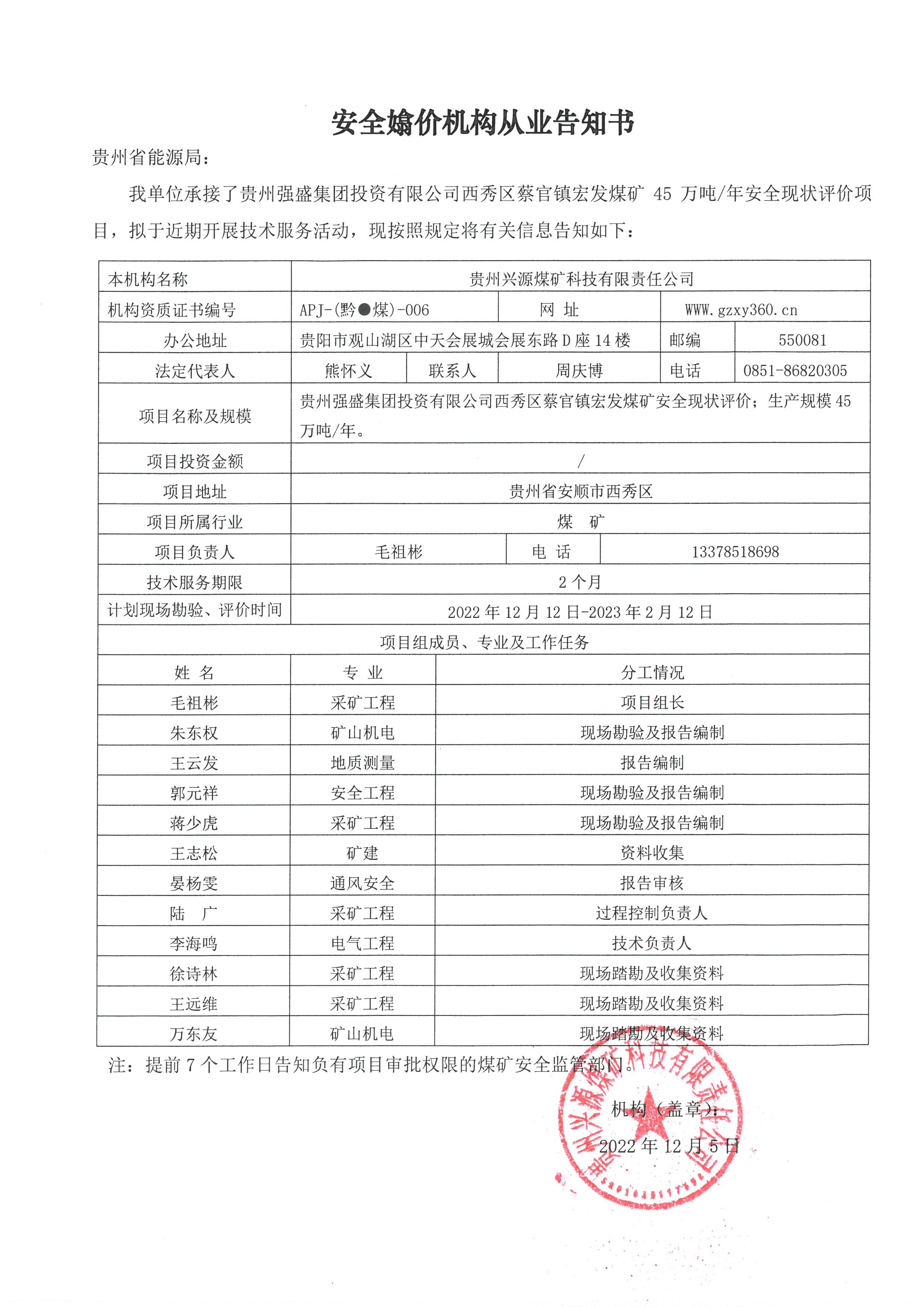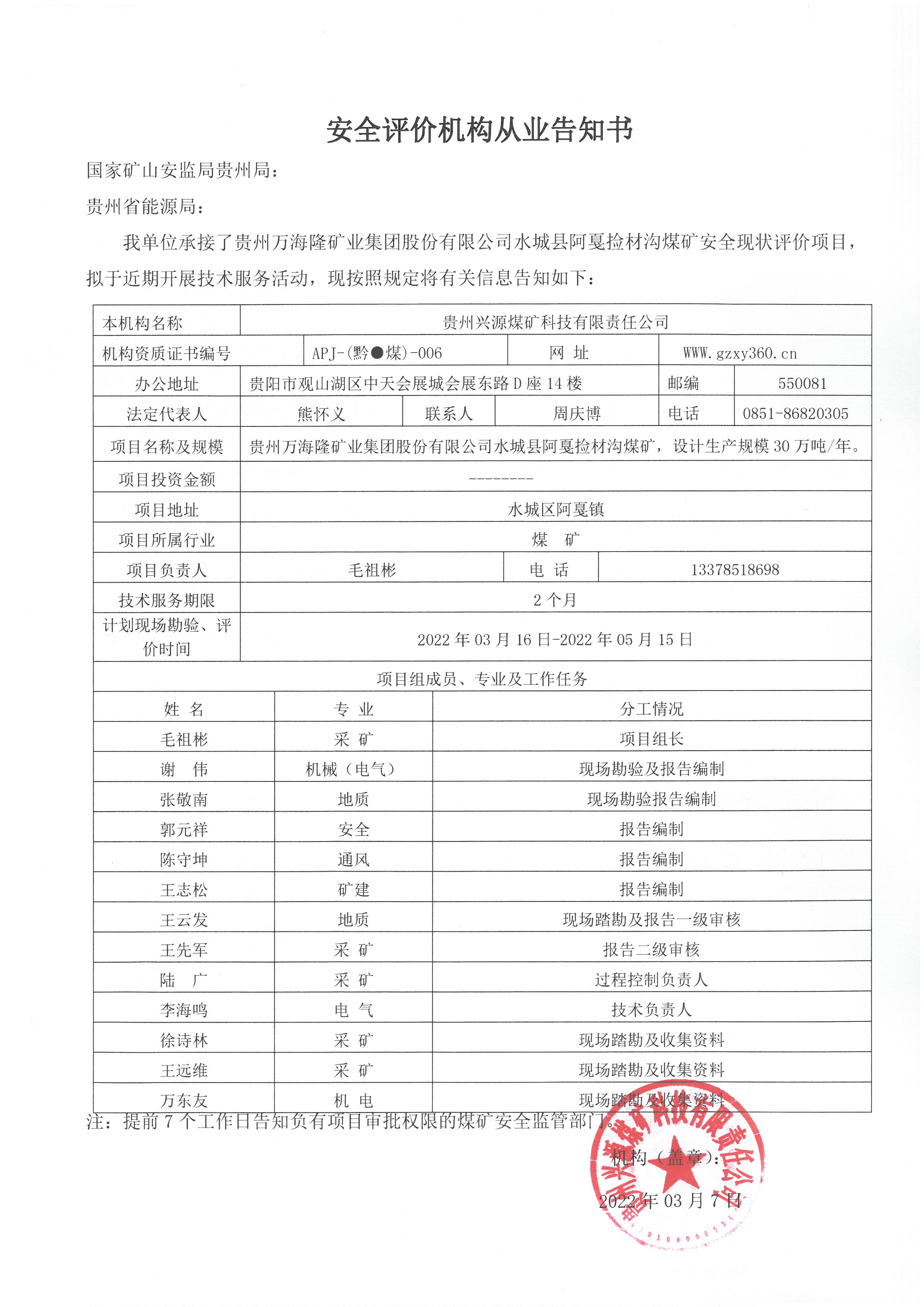 煤礦安全評價機構(gòu)從業(yè)告知書【貴州強盛集團投資有限公司西秀區(qū)蔡官鎮(zhèn)宏發(fā)煤礦】