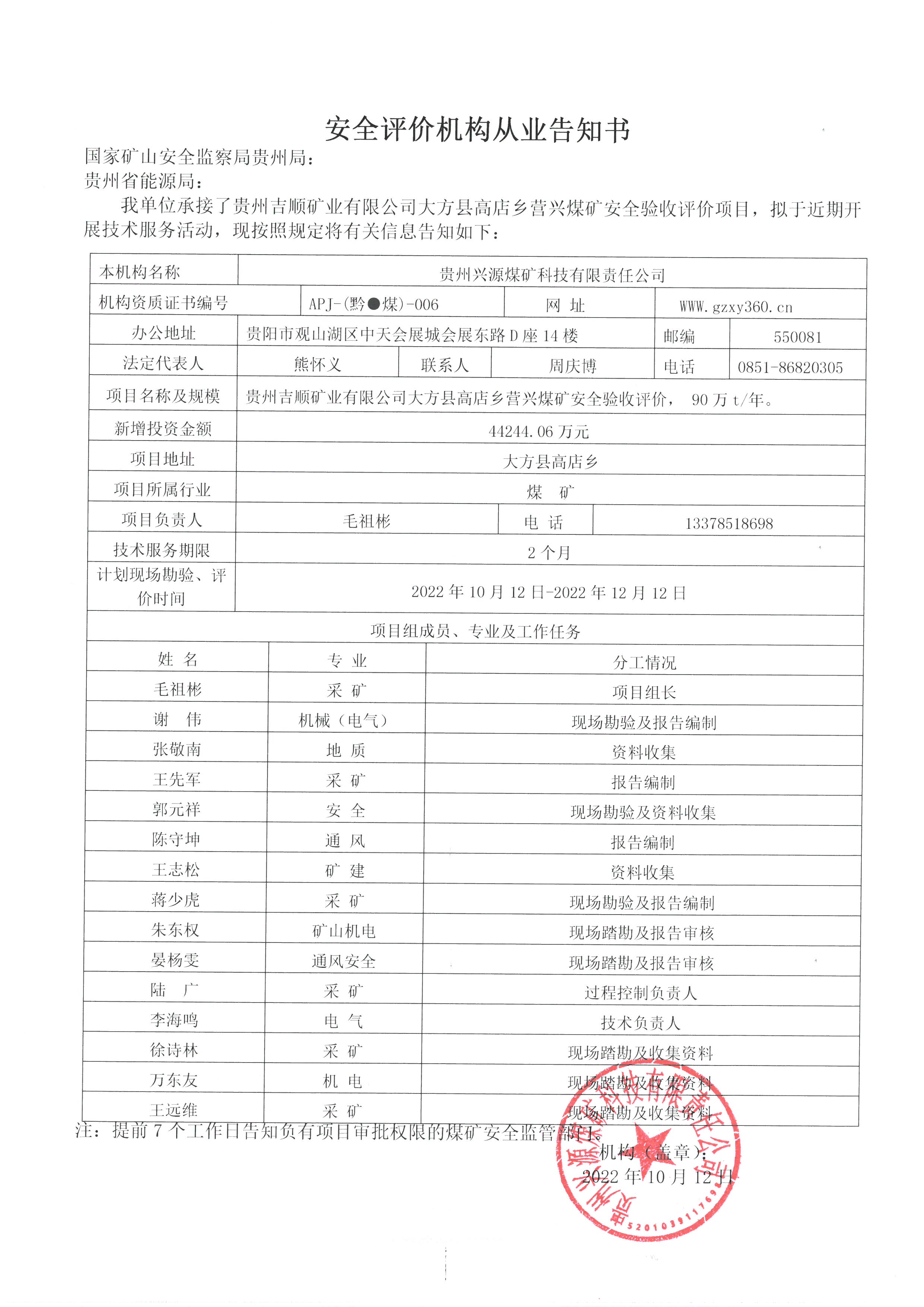 安全評價機構從業(yè)告知書【貴州吉順礦業(yè)有限公司大方縣高店鄉(xiāng)營興煤礦安全驗收評價項目】