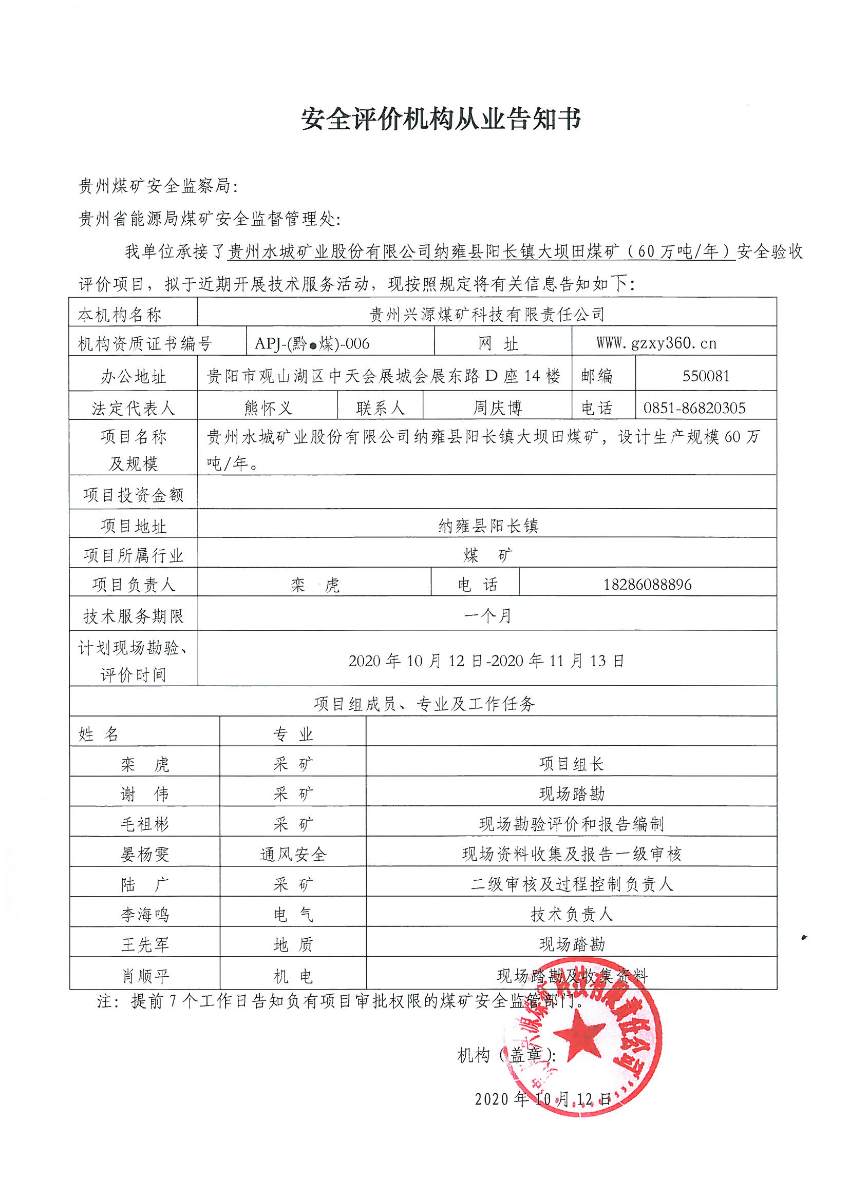 安全評(píng)價(jià)機(jī)構(gòu)從業(yè)告知書(shū)(貴州水城礦業(yè)股份有限公司納雍縣陽(yáng)長(zhǎng)鎮(zhèn)大壩田煤礦)