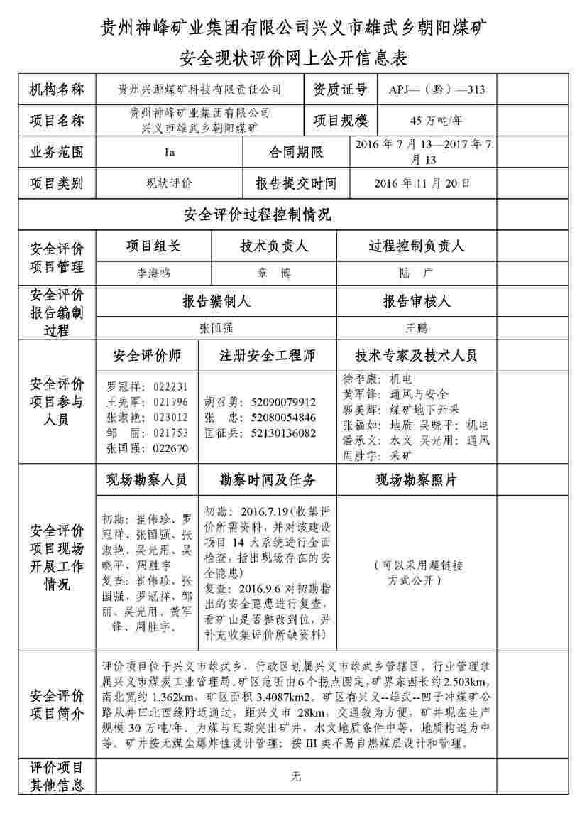 貴州神峰礦業(yè)集團(tuán)有限公司興義市雄武鄉(xiāng)朝陽(yáng)煤礦安全現(xiàn)狀評(píng)價(jià)網(wǎng)上公開(kāi)信息表
