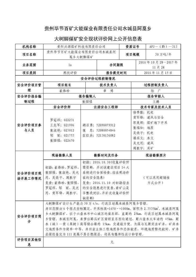 水城縣阿戛鄉(xiāng)大樹腳煤礦安全現(xiàn)狀評價網(wǎng)上公開信息表