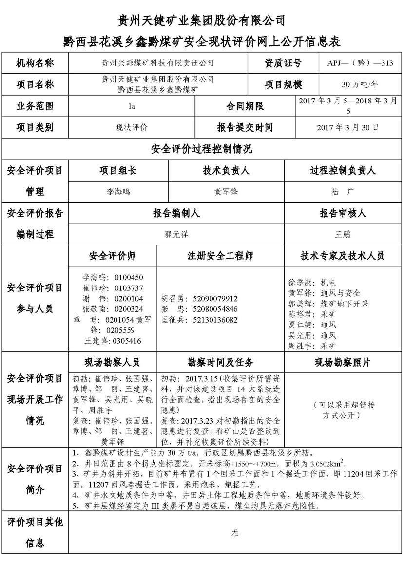 貴州天健礦業(yè)集團(tuán)股份有限公司黔西縣花溪鄉(xiāng)鑫黔煤礦安全現(xiàn)狀評(píng)價(jià)網(wǎng)上公開信息表