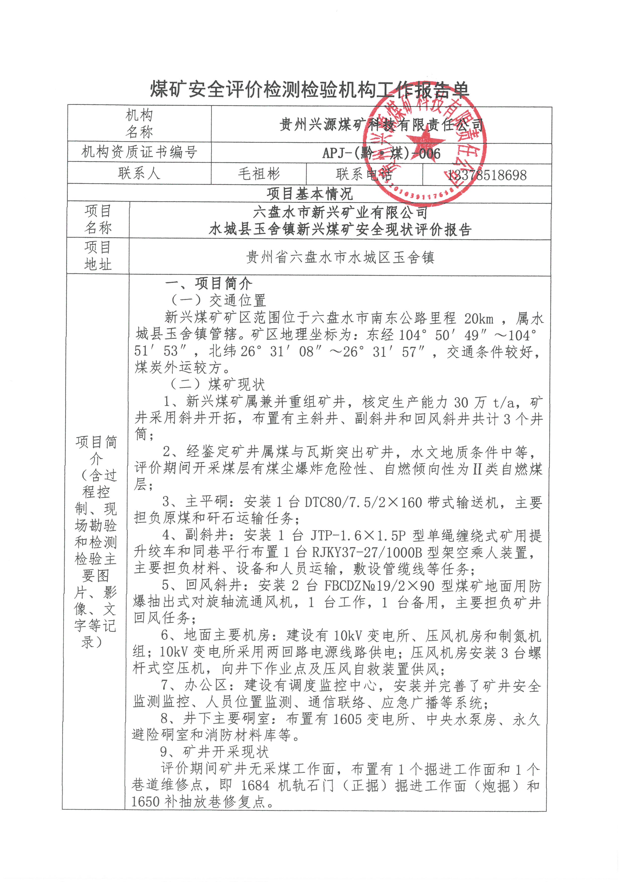 煤礦安全評價檢測檢驗機構(gòu)工作報告單[六盤水市新興礦業(yè)有限公司水城縣玉舍鎮(zhèn)新興煤礦安全現(xiàn)狀評價報告]