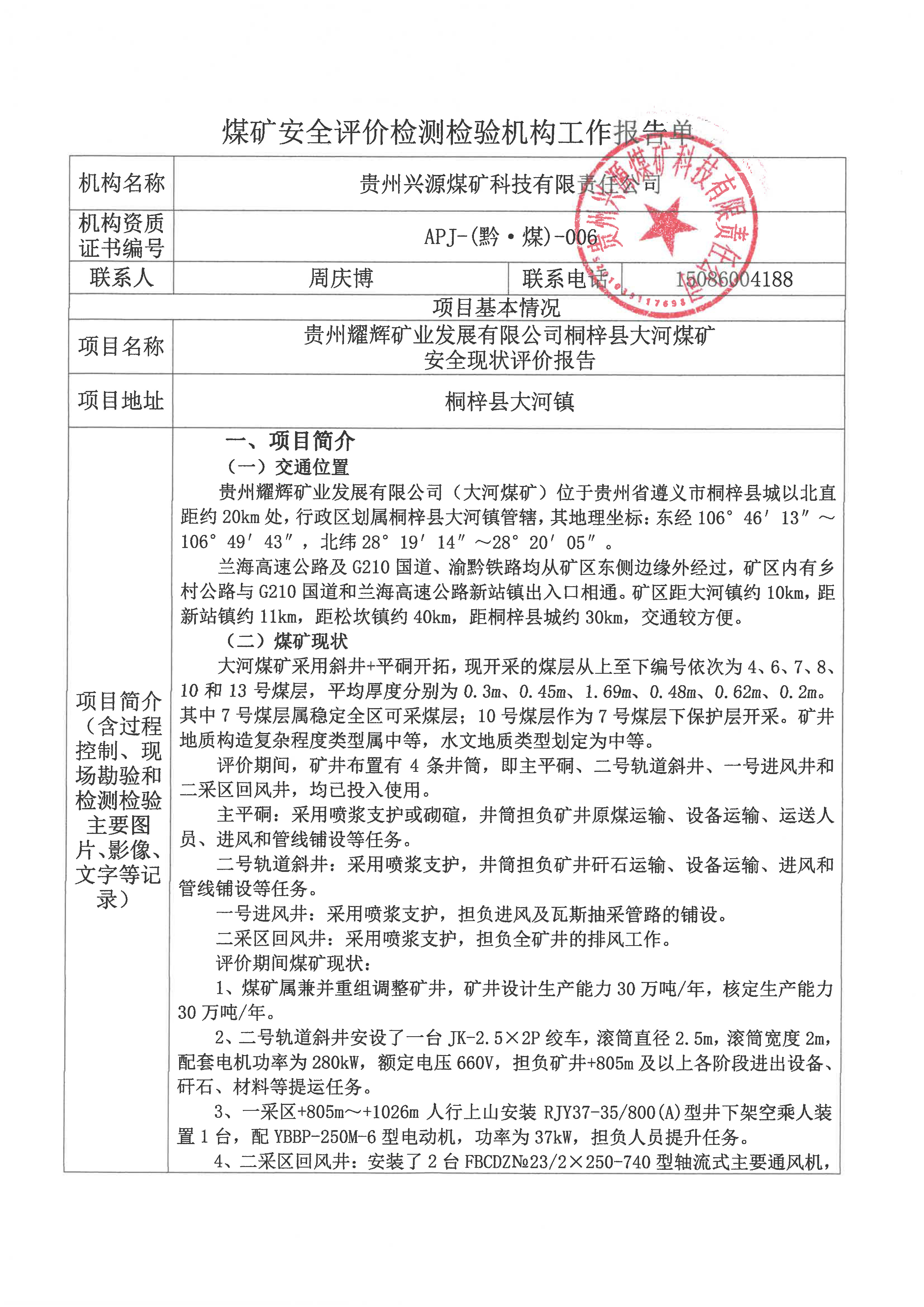 煤礦安全評價檢測檢驗機構(gòu)工作報告單【貴州耀輝礦業(yè)發(fā)展有限公司桐梓縣大河煤礦安全現(xiàn)狀評價報告】